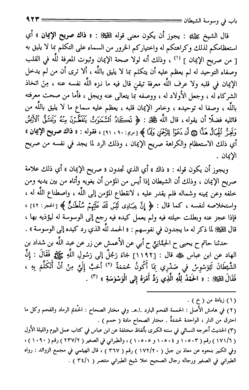 1192 - حدثنا حاتم، حدثنا يحيى، حدثنا الحماني، حدثنا أبي، عن الأعمش، عن زر، عن عبد الله بن شداد بن الهاد، عن ابن عباس - رضي الله عنه - قال: " جاء رجلٌ إلى رسول الله - صلى الله عليه وسلم - فقال: إن الشيطان ليوسوس في صدري بما أن أكون حٌمَمَةً أحب إلي من أن أتكلم به، فقال عليه السلام: " الحمد لله الذي رد أمره إلى الوسوسة ".