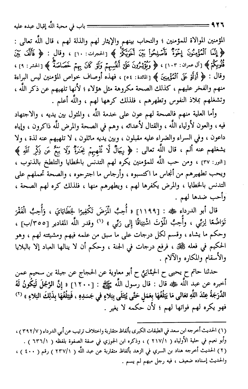 1200 - حدثنا حاتم، حدثنا يحيى، حدثنا الحماني، حدثنا أبو معاوية، عن الحجاج، عن جبلة بن سُحيم، عمن أخبره، عن عبد الله - رضي الله عنه - قال: قال رسول الله صلى الله عليه وسلم: " إن الرجل ليكون له الدرجة عند الله تعالى يبلغها بعمل حتى يبتلى ببلاء في جسده فيبلغهما بذلك البلاء ".