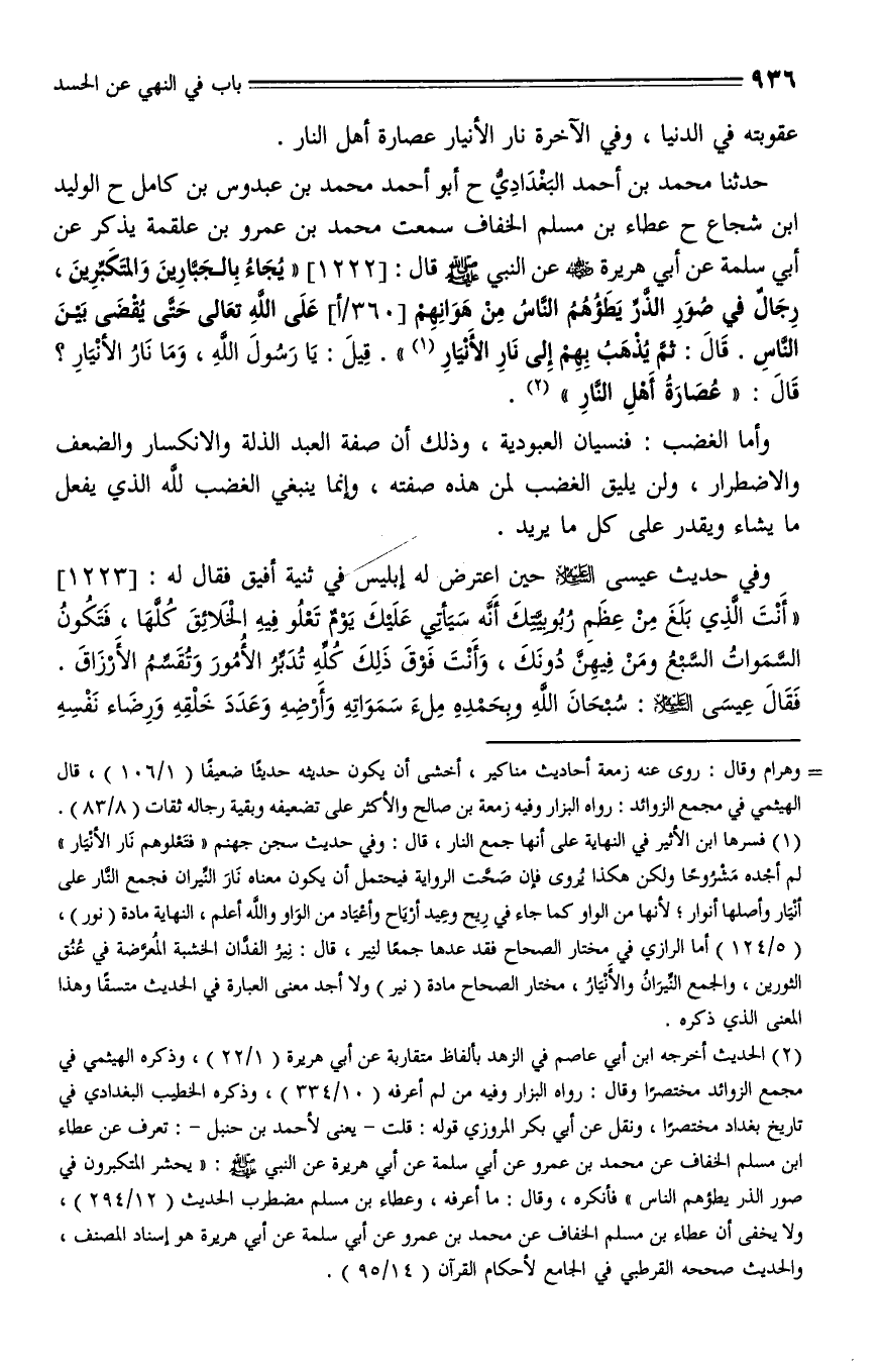 1222 - حدثنا محمد بن أحمد البغدادي، حدثنا أبو أحمد محمد بن عبدوس بن كامل، حَدَّثَنا الْوَلِيدُ بْنُ شُجَاعٍ، حَدَّثَنَا عَطَاءُ بْنُ مُسْلِمٍ الْخَفَّافُ، سَمِعْتُ مُحَمَّدَ بْنَ عَمْرِو بْنِ عَلْقَمَةَ، يَذْكُرُ عَنْ أَبِي سَلَمَةَ، عَنْ أَبِي هُرَيْرَةَ - رضي الله عنه - عَنِ النَّبِيِّ - صلى الله عليه وسلم - قَالَ: " يُجَاءُ بِالْجَبَّارِينَ وَالْمُتَكَبِّرِينَ رِجَالاً فِي صُورَةِ الذَّرِ يَطَؤُهُمُ النَّاسُ مِنْ هَوَانِهِمْ عَلَى اللَّهِ تعالى، حَتَّى يُقْضَى بَيْنَ النَّاسِ , قَالَ: ثُمَّ يُذْهَبُ بِهِمْ إِلَى نَارِ الأَنْيَارِ " , قَالَ: قِيلَ: يَا رَسُولَ اللَّهِ، وَمَا نَارُ الأَنْيَارِ؟ قَالَ: " عُصَارَةُ أَهْلِ النَّارِ ".