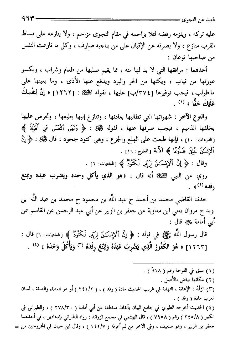 1263 - حدثنا القاضي محمد بن أحمد، حدثنا عبد الله بن محمود، حدثنا محمد بن عبد الله بن يزيد، حدثنا مروان يعني ابن معاوية، عن جعفر بن الزبير، عن أبي عبد الرحمن، عن القاسم، عن أبي أمامة - رضي الله عنه - قال: قال رسول الله صلى الله عليه وسلم: " في قوله {إن الإنسان لربه لكنود}، قال: " هو الكفور الذي يضرب عبده، ويمنع رفده، ويأكل وحده ".