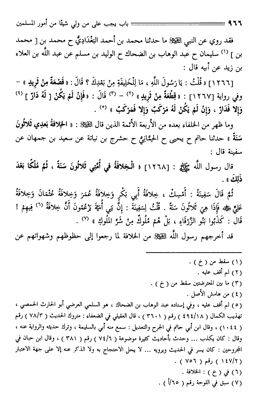 1268 - حدثنا حاتم، حدثنا يحيى، حدثنا الحماني، حدثنا حشرج بن نباتة، عن سعيد بن جهمان، عن سفينة، قال: قال رسول الله صلى الله عليه وسلم: " الخلافة في أمتي ثلاثون سنة، ثم ملكٌ بعد ذلك ". ثم قال سفينة: أمسك، خلافة أبي بكر، وخلافة عمر، خلافة عثمان، وخلافة علي، رضي الله عنهم، فإذا هي ثلاثون سنة، قلت لسفينة: إن بني أمية يزعمون أن الخلافة فيهم، قال: كذبوا بنو الزرقاء، بل هم ملوكٌ من شر الملوك.