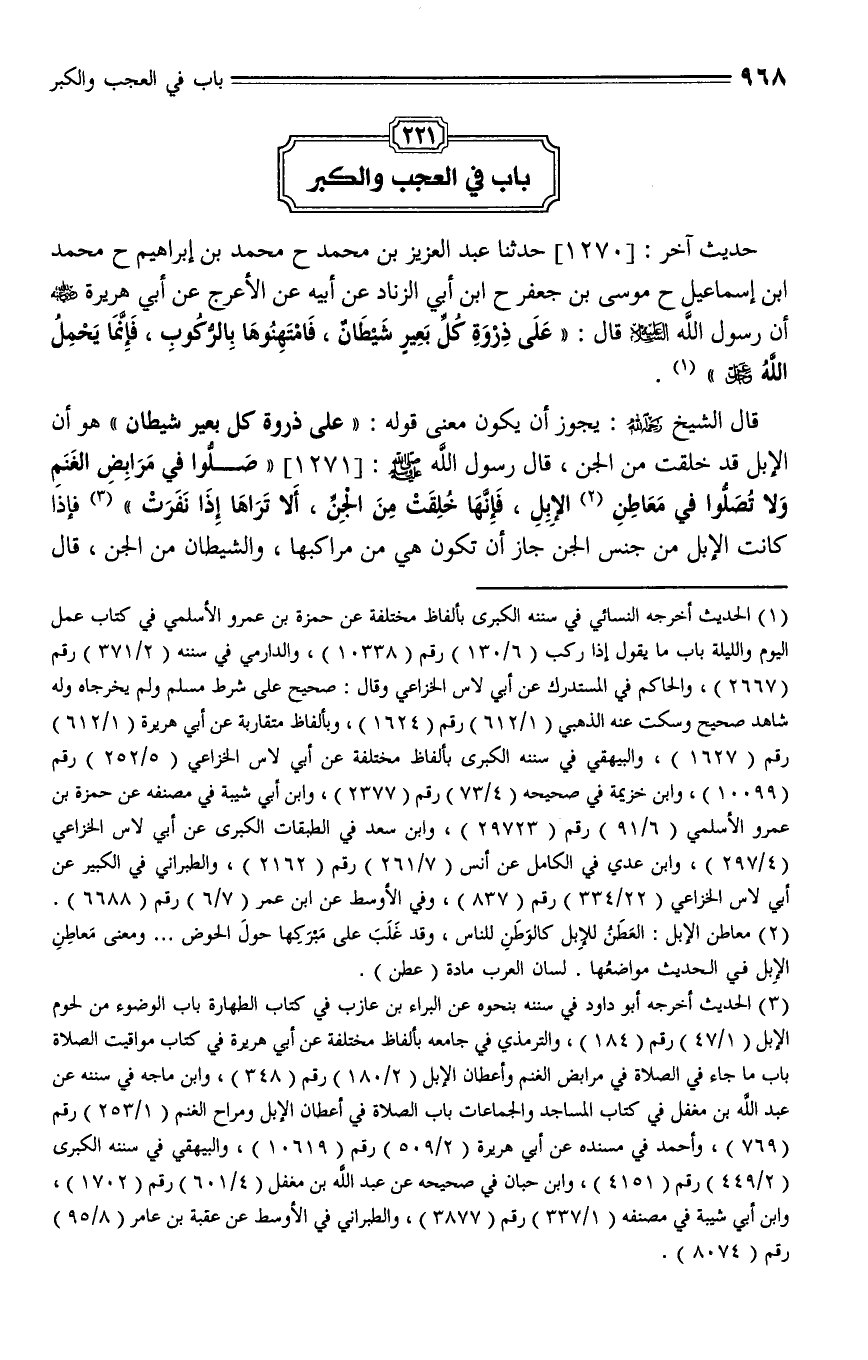 1270 - حدثنا عبد العزيز بن محمد، حدثنا محمد بن إبراهيم، حدثنا محمد بن إسماعيل، حدثنا موسى بن جعفر، حدثنا ابن أبي الزناد، عن أبيه، عن الأعرج، عن أبي هريرة - رضي الله عنه - أن رسول الله - عليه السلام - قال: " على ذروة كل بعير شيطان، فامتهنوها بالركوب فإنما يحمل الله - عز وجل - ".