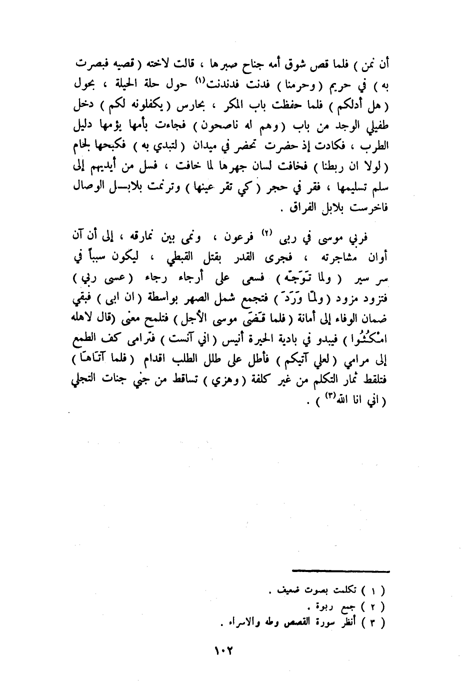 فربي مُوسَى فِي ربى فِرْعَوْن ونمى بَين نمارقه إِلَى أَن آن أَوَان مشاجرته فَجرى الْقدر بقتل القبطي ليَكُون سَببا فِي سر سير {وَلما توجه} فسعى على أرجاء رَجَاء {عَسى رَبِّي} فتزود مزود {وَلما ورد} فتجمع شَمل الصهر بِوَاسِطَة {إِن أبي} فَبَقيَ ضَمَان الْوَفَاء إِلَى أَمَانَة {فَلَمَّا قضى مُوسَى الْأَجَل} فتلمح معنى {قَالَ لأَهله امكثوا} فيبدو فِي بادية الْحيرَة أنيس {إِنِّي آنست} فترامى كف الطمع إِلَى مرامي {لعَلي آتيكم} فأطل على طلل الطّلب أَقْدَام {فَلَمَّا أَتَاهَا} فتلقط ثمار التَّكَلُّم من غير كلفة {وهزي} تساقط من جني جنَّات التجلي {إِنِّي أَنا الله}