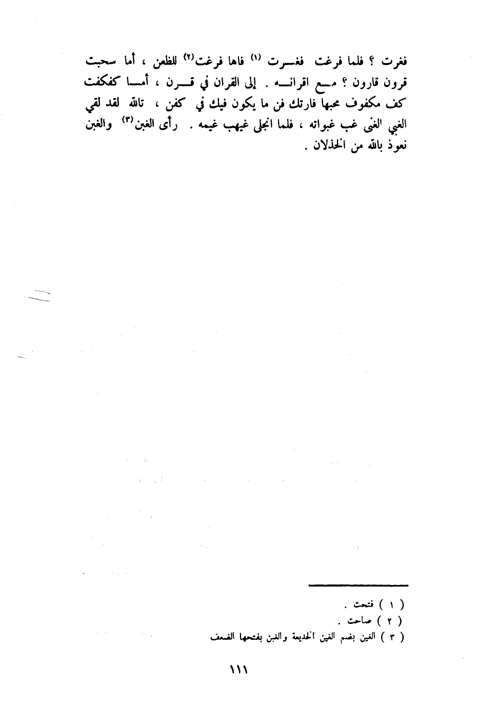 فغرت فَلَمَّا فرغت فغرت فاها فرغت للظعن أما سحبت قُرُون قَارون مَعَ أقرانه إِلَى الْقُرْآن فِي قرن أما كفكفت كف مكفوف محبها فارتك فن مَا يكون فِيك فِي كفن تالله لقد لَقِي الغبي الْغَنِيّ غب غبواته فَلَمَّا انجلى غيهب غيمه رأى الْغبن والغبن نَعُوذ بِاللَّه من الخذلان