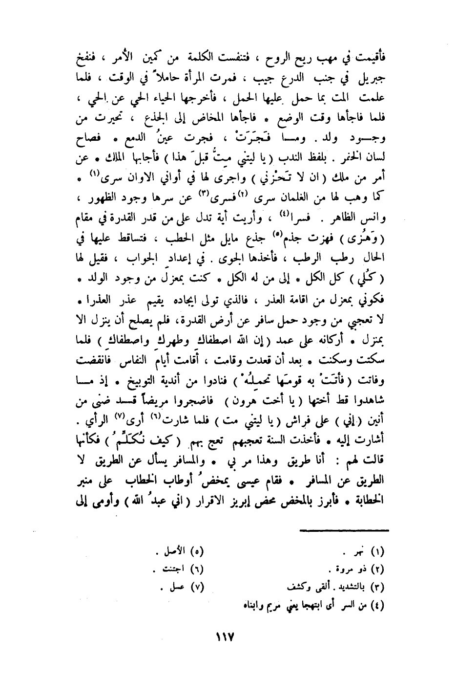 فأقيمت فِي مهب ريح الرّوح فتنفست الْكَلِمَة من كمين الْأَمر فَنفخ جِبْرِيل فِي جنب الدرْع جيب فمرت الْمَرْأَة حَامِلا فِي الْوَقْت فَلَمَّا علمت ألمت بِمَا حمل عَلَيْهَا الْحمل فأخرجها الْحيَاء الْحَيّ عَن الْحَيّ فَلَمَّا فاجأها وَقت الْوَضع فاجأها الْمَخَاض إِلَى الْجذع تحيرت من وجود ولد وَمَا فجرت فجرت عين الدمع فصاح لِسَان الخفر بِلَفْظ النّدب {يَا لَيْتَني مت قبل هَذَا} فأجابها الْملك عَن أَمر من ملك {أَلا تحزني} وأجرى لَهَا فِي أواني الأوان سرى كَمَا وهب لَهَا من الغلمان سرى فسرى عَن سرها وجود الظُّهُور وَأنس الظَّاهِر فسرا وأريت أَيَّة تدل على من قدر الْقُدْرَة فِي مقَام {وهزي} فهزت جذم جذع مايل مثل الْحَطب فتساقط عَلَيْهَا فِي الْحَال رطب الرطب فَأَخذهَا الجوى فِي إعداد الْجَواب فَقيل لَهَا {كلي} كل الْكل إِلَى من لَهُ الْكل كنت بمعزل من وجود الْوَلَد فكوني بمعزل من إِقَامَة الْعذر فَالَّذِي تولى إيجاده يُقيم عذر العذرا لَا تعجبي من وجود حمل سَافر عَن أَرض الْقُدْرَة فَلم يصلح أَن ينزل إِلَّا بمنزل أَرْكَانه على عمد {إِن الله اصطفاك وطهرك واصطفاك} فَلَمَّا سكتت وسكنت بعد أَن قعدت وَقَامَت أَقَامَت أَيَّام النّفاس فانقضت وفاتت {فَأَتَت بِهِ قَومهَا تحمله} فَنَادوا من أندية التوبيخ إِذْ مَا شاهدوا قطّ أُخْتهَا {يَا أُخْت هَارُون} فاضجروا مَرِيضا قد ضنى من أَنِين {إِنِّي} على فرَاش {يَا لَيْتَني مت} فَلَمَّا شارت أرى الرَّأْي أشارت إِلَيْهِ فَأخذت أَلْسِنَة تعجبهم تعج بهم {كَيفَ نُكَلِّم} فَكَأَنَّهَا قَالَت لَهُم أَنا طَرِيق وَهَذَا مر بِي وَالْمُسَافر يسْأَل عَن الطَّرِيق لَا الطَّرِيق عَن الْمُسَافِر فَقَامَ عِيسَى يمخض أوطاب الْخطاب على مِنْبَر الخطابة فأبرز بالمخض مَحْض إبريز الْإِقْرَار {إِنِّي عبد الله} وأومى إِلَى