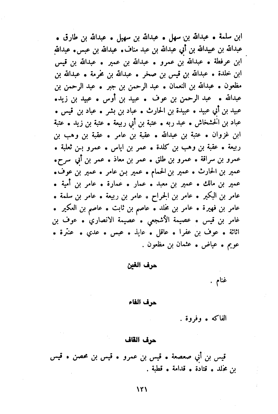 ابْن سَلمَة عبد الله بن سهل عبد الله بن سُهَيْل عبد الله بن طَارق عبد الله بن عبيد الله بن أبي عبد الله بن عبد منَاف عبد الله بن عبس عبد الله ابْن عرفطة عبد الله بن عَمْرو عبد الله بن عُمَيْر عبد الله بن قيس ابْن خلدَة عبد الله بن قيس بن صَخْر عبد الله بن مخرمَة عبد الله بن مَظْعُون عبد الله بن النُّعْمَان عبد الرَّحْمَن بن جبر عبد الرَّحْمَن بن عبد الله عبد الرَّحْمَن بن عَوْف عبيد بن أَوْس عبيد بن زيد عبيد بن أبي عبيد عُبَيْدَة بن الْحَارِث عباد بن بشر عباد بن قيس عباد بن الخشخاش عبد ربه عتبَة بن أبي ربيعَة عتبَة بن زيد عتبَة ابْن غَزوَان عتبَة بن عبد الله عقبَة بن عَامر عقبَة بن وهب بن ربيعَة عقبَة بن وهب بن كلدة عمر بن اياس عَمْرو بن ثَعْلَبَة عَمْرو بن سراقَة عَمْرو بن طلق عمر بن معَاذ عمر بن أبي سرح عُمَيْر بن الْحَارِث عُمَيْر بن الْحمام عُمَيْر بن عَامر عُمَيْر بن عَوْف عُمَيْر بن مَالك عُمَيْر بن معبد عمار عمَارَة عَامر بن أُميَّة عَامر بن البكير عَامر بن الْجراح عَامر بن ربيعَة عَامر بن سَلمَة عَامر بن فهَيْرَة عَامر بن مخلد عَاصِم بن ثَابت عَاصِم بن العكير عَامر بن قيس عصيمة الْأَشْجَعِيّ عصيمة الْأنْصَارِيّ عَوْف بن أَثَاثَة عَوْف بن عفرا عَاقل عايذ عبس عدي عنترة عويم عِيَاض عُثْمَان بن مَظْعُون