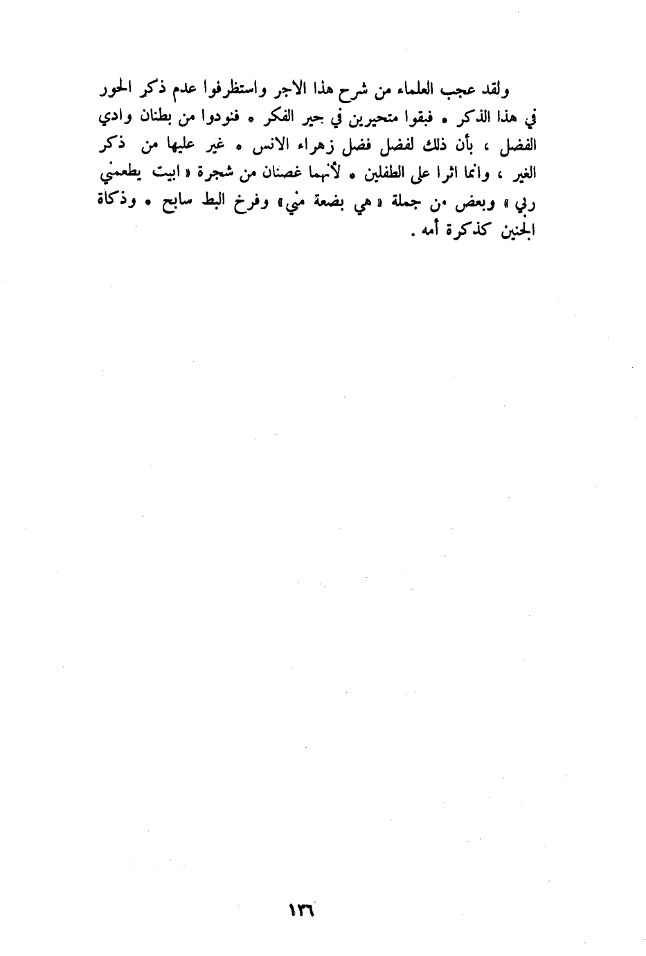 وَلَقَد عجب الْعلمَاء من شرح هَذَا الْأجر واستظرفوا عدم ذكر الْحور فِي هَذَا الذّكر فبقوا متحيرين فِي جير الْفِكر فنودوا من بطْنَان وَادي الْفضل بِأَن ذَلِك لفضل فضل زهراء الْأنس غير عَلَيْهَا من ذكر الْغَيْر وَإِنَّمَا أثرا على الطفلين لِأَنَّهُمَا غصنان من شَجَرَة ابيت يطعمني رَبِّي وَبَعض من جملَة هِيَ بضعَة مني وفرخ البط سابح وذكاة الْجَنِين كذكرة أمه