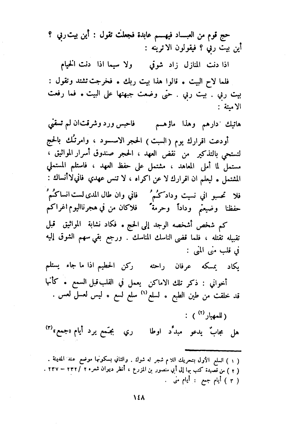 كم شخص أشخصه الوجد إِلَى الْحَج فكاد نشابة المواثيق قبل تقبيله تقتله فَلَمَّا قضى الناسك الْمَنَاسِك وَرجع بَقِي سهم الشوق إِلَيْهِ فِي قلب منى المنى