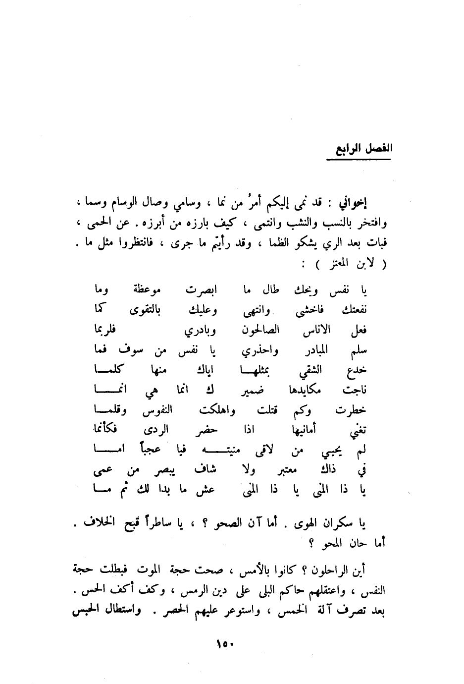 أَيْن الراحلون كَانُوا بالْأَمْس صحت حجَّة الْمَوْت فبطلت حجَّة النَّفس واعتقلهم حَاكم البلى على دين الرمس وكف أكف الْحس بعد تصرف آلَة الْخمس واستوعر عَلَيْهِم الْحصْر واستطال الْحَبْس
