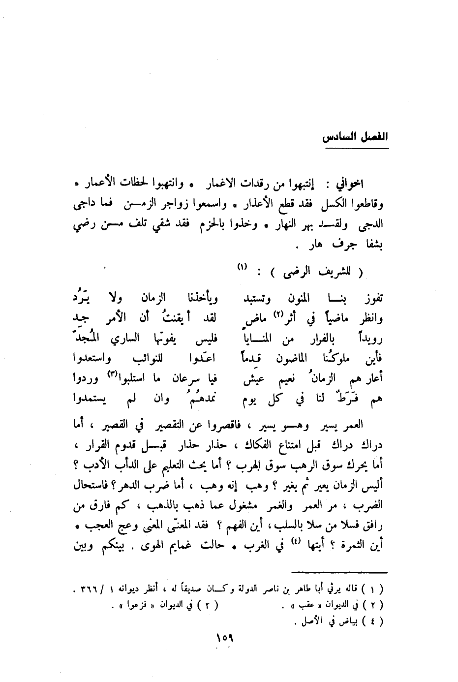 الْعُمر يسير وَهُوَ يسير فاقصروا عَن التَّقْصِير فِي الْقصير أما دراك دراك قبل امْتنَاع الفكاك حذار حذار قبل قدوم الْقَرار أما يُحَرك سوق الرهب سوق الْهَرَب أما يحث التَّعْلِيم على الدأب الْأَدَب أَلَيْسَ الزَّمَان يعير ثمَّ يُغير وهب إِنَّه وهب أما ضرب الدَّهْر فاستحال الضَّرْب مر الْعُمر والغمر مَشْغُول عَمَّا ذهب بِالذَّهَب كم فَارق من رافق فسلا من سلا بالسلب أَيْن الْفَهم فقد الْمَعْنى الْمَعْنى وعج الْعجب أَيْن الثَّمَرَة أيتها فِي الغرب حَالَتْ غمايم الْهوى بَيْنكُم وَبَين