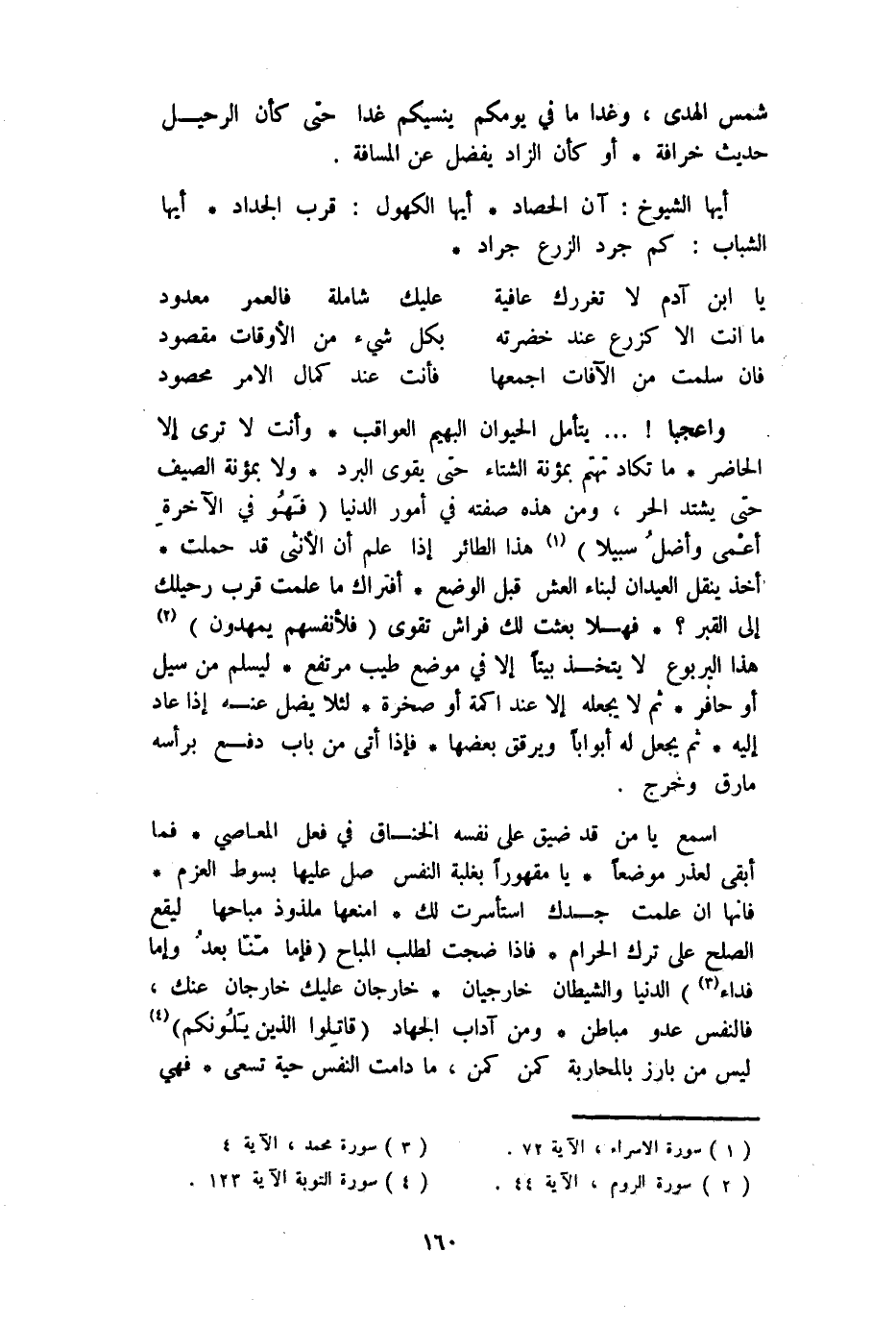 اسْمَع يَا من قد ضيق على نَفسه الخناق فِي فعل الْمعاصِي فَمَا أبقى لعذر موضعا يَا مقهورا بِغَلَبَة النَّفس صل عَلَيْهَا بِسَوْط الْعَزْم فَإِنَّهَا إِن علمت جدك استأسرت لَك امنعها ملذوذ مباحها ليَقَع الصُّلْح على ترك الْحَرَام فَإِذا ضجت لطلب الْمُبَاح {فإمَّا منا بعد وَإِمَّا فدَاء} الدُّنْيَا والشيطان خارجيان خارجان عَلَيْك خارجان عَنْك فَالنَّفْس عَدو مباطن وَمن آدَاب الْجِهَاد {قَاتلُوا الَّذين يلونكم} لَيْسَ من بارز بالمحاربة كمن كمن مَا دَامَت النَّفس حَيَّة تسْعَى فَهِيَ