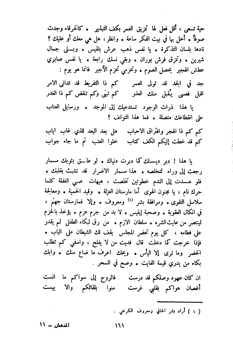 يَا هَذَا ذرات الْوُجُود تستدعيك إِلَى الموجد ورسايل العتاب على انقطاعك مُتَّصِلَة فَمَا هَذَا التَّوَقُّف
