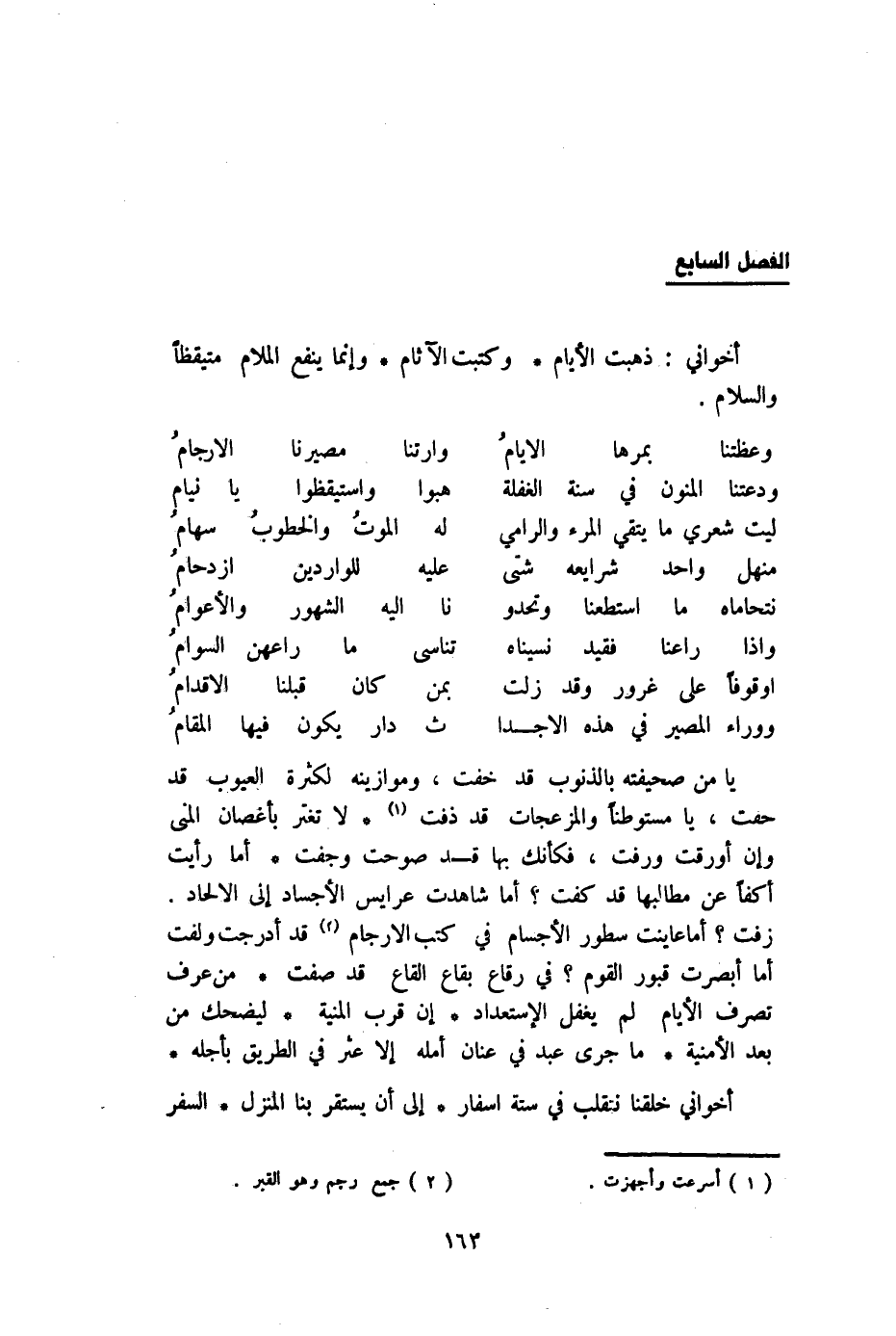 يَا من صَحِيفَته بِالذنُوبِ قد خفت وموازينه لِكَثْرَة الْعُيُوب قد حفت يَا مستوطنا والمزعجات قد ذفت لَا تغتر بأغصان المنى وَإِن أورقت ورفت فكأنك بهَا قد صوحت وجفت أما رَأَيْت أكفا عَن مطالبها قد كفت أما شاهدت عرايس الأجساد إِلَى الالحاد زفت أما عَايَنت سطور الْأَجْسَام فِي كتب الأرجام قد أدرجت ولفت أما أَبْصرت قُبُور الْقَوْم فِي رقاع بقاع القاع قد صفت من عرف تصرف الْأَيَّام لم يغْفل الإستعداد إِن قرب الْمنية ليضحك من بعد الأمنية مَا جرى عبد فِي عنان أمله إِلَّا عثر فِي الطَّرِيق بأجله
