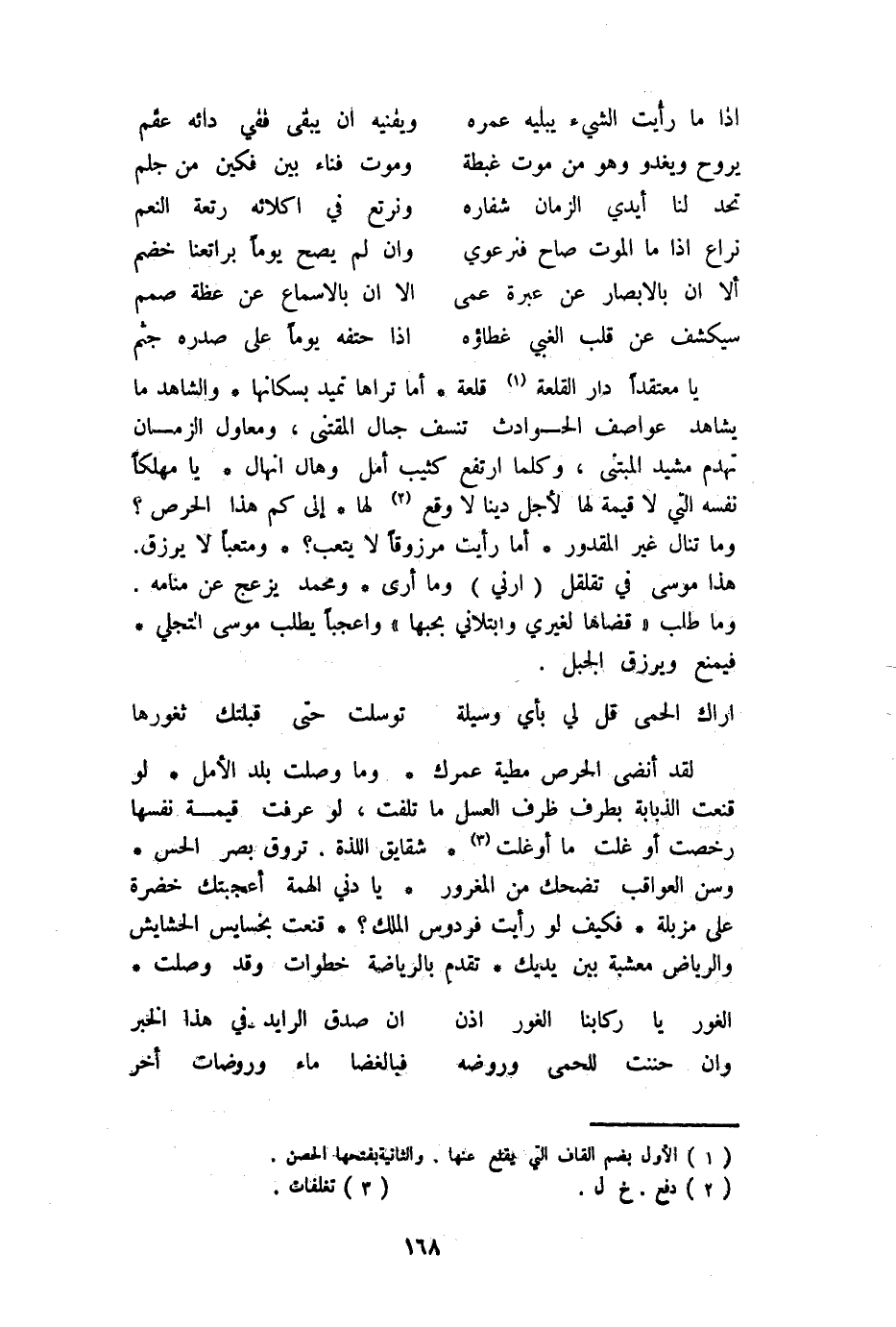 يَا مُعْتَقدًا دَار القلعة قلعة أما ترَاهَا تميد بسكانها وَالشَّاهِد مَا يُشَاهد عواصف الْحَوَادِث تنسف جبال المقتنى ومعاول الزَّمَان تهدم مشيد المبتنى وَكلما ارْتَفع كثيب أمل وهال أنهال يَا مهْلكا نَفسه الَّتِي لَا قيمَة لَهَا لأجل دينا لَا وَقع لَهَا إِلَى كم هَذَا الْحِرْص وَمَا تنَال غير الْمَقْدُور أما رَأَيْت مرزوقا لَا يتعب ومتعبا لَا يرْزق هَذَا مُوسَى فِي تقلقل {أَرِنِي} وَمَا أرى وَمُحَمّد يزعج عَن مَنَامه وَمَا طلب قَضَاهَا لغيري وابتلاني بحبها وَاعجَبا يطْلب مُوسَى التجلي فَيمْنَع ويرزق الْجَبَل
