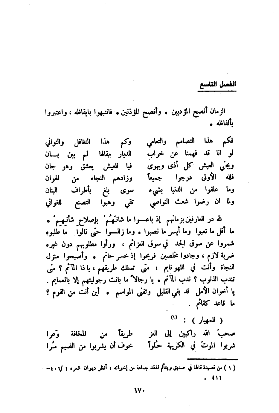 لله در العارفين بزمانهم إِذْ باعوا مَا شانهم بإصلاح شَأْنهمْ مَا أقل مَا تعبوا وَمَا ايسر مَا نصبوا وَمَا زَالُوا حَتَّى نالوا مَا طلبوه شمروا عَن سوق الْجد فِي سوق العزائم وَرَأَوا مطلوبهم دون غَيره ضَرْبَة لَازم وجادوا مُخلصين فَرَبِحُوا إِذْ خسر حَاتِم وَأَصْبحُوا منزل النجَاة وَأَنت فِي اللَّهْو نايم مَتى تسلك طريقهم يَا ذَا المآثم مَتى تندب الذُّنُوب ندب المآتم يَا رجَالًا مَا بَانَتْ رجوليتهم إِلَّا بالعمايم يَا أَخَوان الأمل قد بَقِي الْقَلِيل وتفنى المواسم أَيْن أَنْت من الْقَوْم مَا قَاعد كقائم