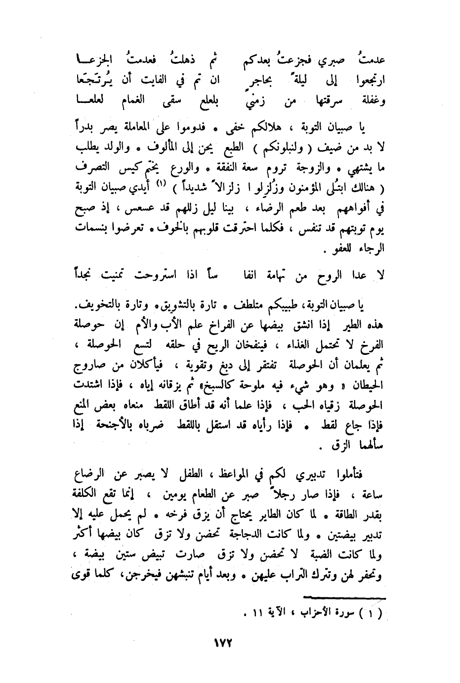 يَا صبيان التَّوْبَة طبيبكم متلطف تَارَة بالتشويق وَتارَة بالتخويف هَذِه الطير إِذا انْشَقَّ بيضها عَن الْفِرَاخ علم الْأَب وَالأُم إِن حوصلة الفرخ لَا تحْتَمل الْغذَاء فينفخان الرّيح فِي حلقه لتسْع الحوصلة ثمَّ يعلمَانِ أَن الحوصلة تفْتَقر إِلَى دبغ وتقوية فيأكلان من صاروج الْحِيطَان وَهُوَ شَيْء فِيهِ ملوحة كالسبخ ثمَّ يزقانه إِيَّاه فَإِذا اشتدت الحوصلة زقياه الْحبّ فَإِذا علما أَنه قد أطَاق اللقط منعاه بعض الْمَنْع فَإِذا جَاع لقط فَإِذا رأياه قد اسْتَقل باللقط ضرباه بالأجنحة إِذا سَأَلَهُمَا الزق