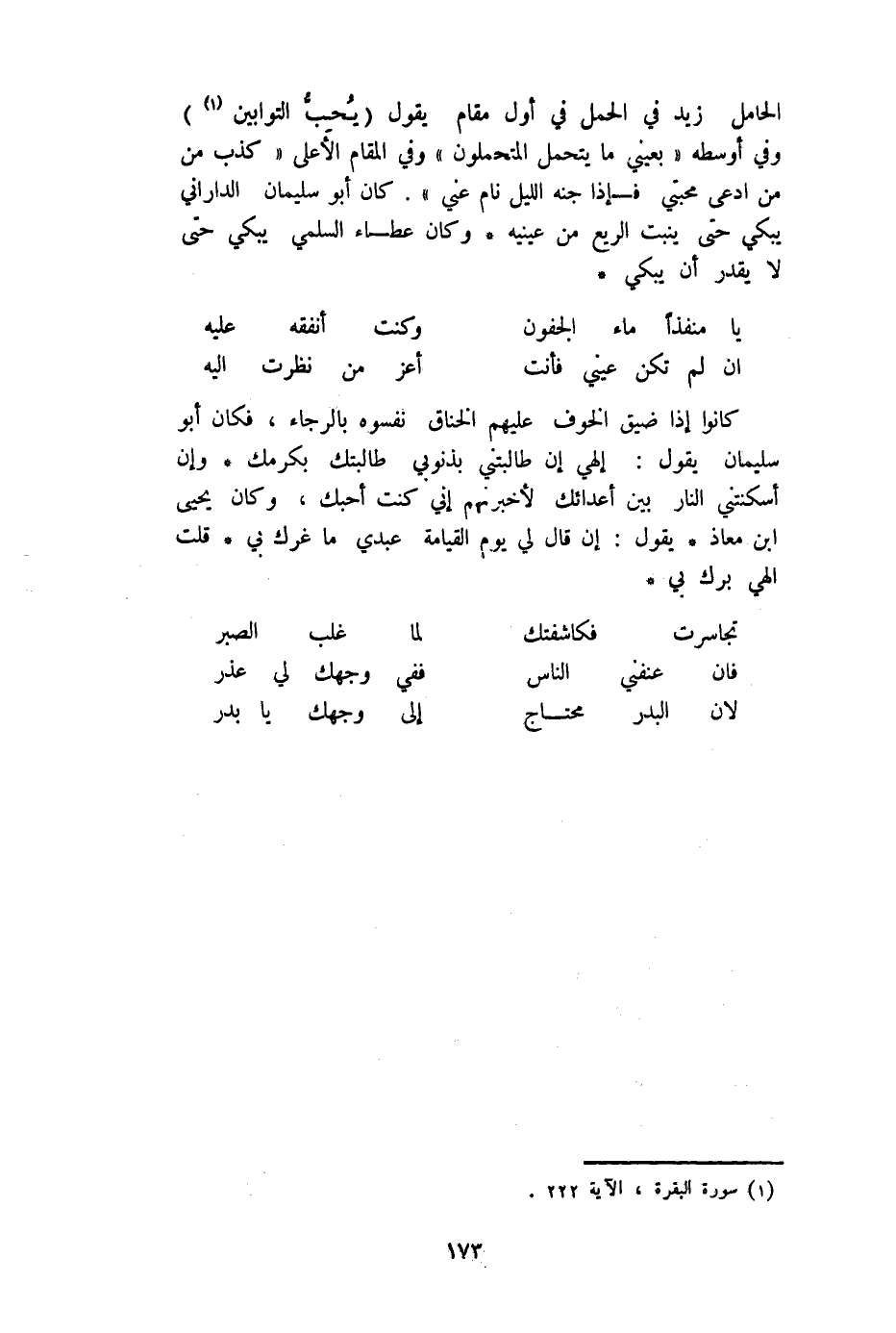 الْحَامِل زيد فِي الْحمل فِي أول مقَام يَقُول {يحب التوابين} وَفِي أوسطه بعيني مَا يتَحَمَّل المتحملون وَفِي الْمقَام الْأَعْلَى كذب من من ادّعى محبتي فَإِذا جنه اللَّيْل نَام عني كَانَ أَبُو سُلَيْمَان الدَّارَانِي يبكي حَتَّى ينْبت الرّيع من عَيْنَيْهِ وَكَانَ عَطاء السلمى يبكي حَتَّى لَا يقدر أَن يبكي