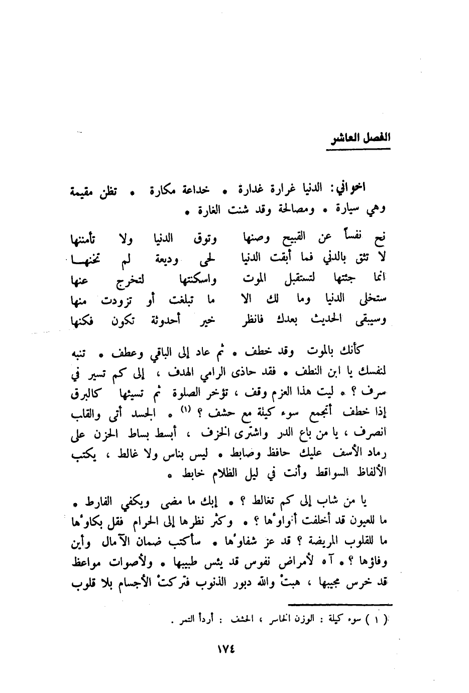 كَأَنَّك بِالْمَوْتِ وَقد خطف ثمَّ عَاد إِلَى الْبَاقِي وَعطف تنبه لنَفسك يَا ابْن النطف فقد حَاذَى الرَّامِي الهدف إِلَى كم تسير فِي سرف لَيْت هَذَا الْعَزْم وقف تُؤخر الصلوة ثمَّ تسيئها كالبرق إِذا خطف أتجمع سوء كيلة مَعَ حشف الْجَسَد أَتَى وَالْقلب انْصَرف يَا من بَاعَ الدّرّ وَاشْترى الخزف أبسط بِسَاط الْحزن على رماد الأسف عَلَيْك حَافظ وصابط لَيْسَ بناس وَلَا غالط يكْتب الْأَلْفَاظ السواقط وَأَنت فِي ليل الظلام خابط