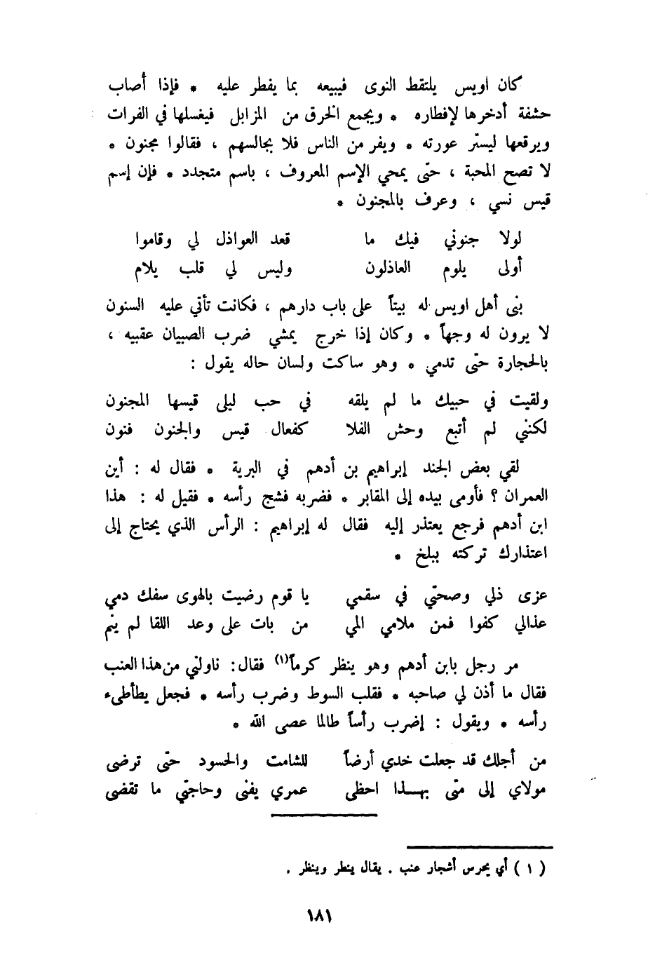 كَانَ اويس يلتقط النَّوَى فيبيعه بِمَا يفْطر عَلَيْهِ فَإِذا أصَاب حَشَفَة أدخرها لإفطاره وَيجمع الْخرق من الْمَزَابِل فيغسلها فِي الْفُرَات ويرقعها ليستر عَوْرَته ويفر من النَّاس فَلَا يجالسهم فَقَالُوا مَجْنُون لَا تصح الْمحبَّة حَتَّى يمحي الإسم الْمَعْرُوف باسم متجدد فَإِن إسم قيس نسي وَعرف بالمجنون