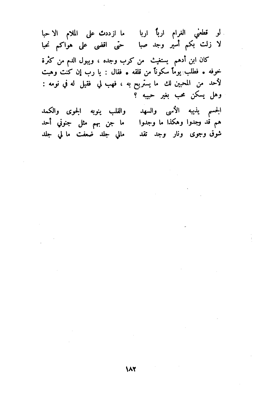 (الْجِسْم يذيبه الأسى والسهد ... وَالْقلب ينوبه الجوى والكمد)
