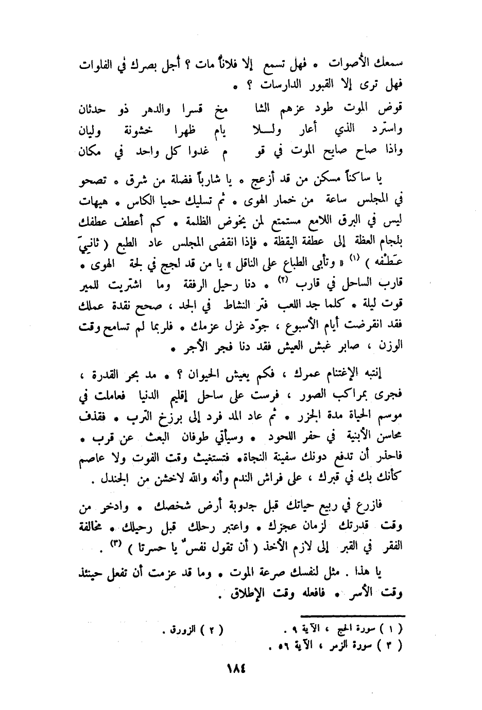 إنتبه الإغتنام عمرك فكم يعِيش الْحَيَوَان مد بَحر الْقُدْرَة فَجرى بمراكب الصُّور فرست على سَاحل إقليم الدُّنْيَا فعاملت فِي موسم الْحَيَاة مُدَّة الجزر ثمَّ عَاد الْمَدّ فَرد الى برزخ الترب فقذف محَاسِن الْأَبْنِيَة فِي حفر اللحود وَسَيَأْتِي طوفان الْبَعْث عَن قرب فاحذر أَن تدفع دُونك سفينة النجَاة فتستغيث وَقت الْفَوْت وَلَا عَاصِم كَأَنَّك بك فِي قبرك على فرَاش النَّدَم وَأَنه وَالله لأخشن من الجندل