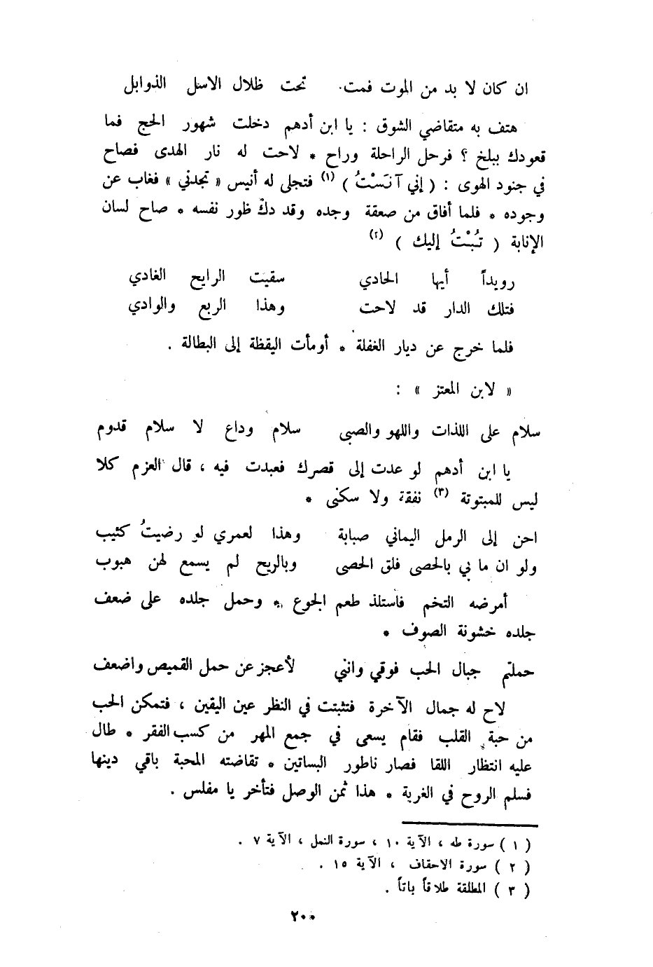 هتف بِهِ متقاضي الشوق يَا ابْن أدهم دخلت شهور الْحَج فَمَا قعودك ببلخ فَرَحل الرَّاحِلَة وَرَاح لاحت لَهُ نَار الْهدى فصاح فِي جنود الْهوى {إِنِّي آنست} فتجلى لَهُ أنيس تجدني فَغَاب عَن وجوده فَلَمَّا أَفَاق من صعقة وجده وَقد دك ظور نَفسه صَاح لِسَان الْإِنَابَة {تبت إِلَيْك}