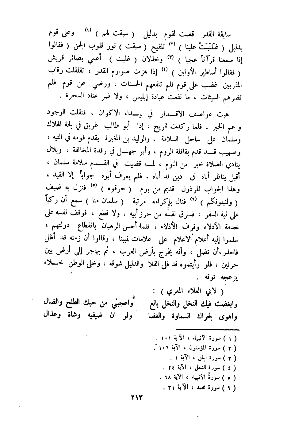 هبت عواصف الأقدار فِي بيداء الأكوان فنقلت الْوُجُود وَعم الْخَبَر فَلَمَّا ركدت الرّيح إِذا أَبُو طَالب غريق فِي لجة الْهَلَاك وسلمان على سَاحل السَّلامَة والوليد بن الْمُغيرَة يقدم قومه فِي التيه وصهيب قد قدم بقافلة الرّوم وَأَبُو جهل فِي رقدة الْمُخَالفَة وبلال يُنَادي الصَّلَاة خير من النّوم لما قضيت فِي الْقدَم سَلامَة سلمَان أقبل يناظر أَبَاهُ فِي دين قد أَبَاهُ فَلم يعرف أَبوهُ جَوَابا إِلَّا الْقَيْد وَهَذَا الْجَواب المرذول قديم من يَوْم {حرقوه} فَنزل بِهِ ضيف {ولنبلونكم} فنال بإكرامه مرتبَة سلمَان منا سمع أَن ركبا على نِيَّة السّفر فَسرق نَفسه من حرز أَبِيه وَلَا قطع فَوقف نَفسه على خدمَة الأدلاء وقرف الأذلاء فَلَمَّا أحس الرهبان بِانْقِطَاع دولتهم سلمُوا إِلَيْهِ أَعْلَام الْأَعْلَام على عَلَامَات نَبينَا وَقَالُوا أَن زَمَنه قد أظل فاحذر أَن تضل وَأَنه يخرج بِأَرْض الْعَرَب ثمَّ يُهَاجر إِلَى أَرض بَين حرتين فَلَو رَأَيْتُمُوهُ قد فلى الفلا وَالدَّلِيل شوقه وخلى الوطن خلاء يزعجه توقه