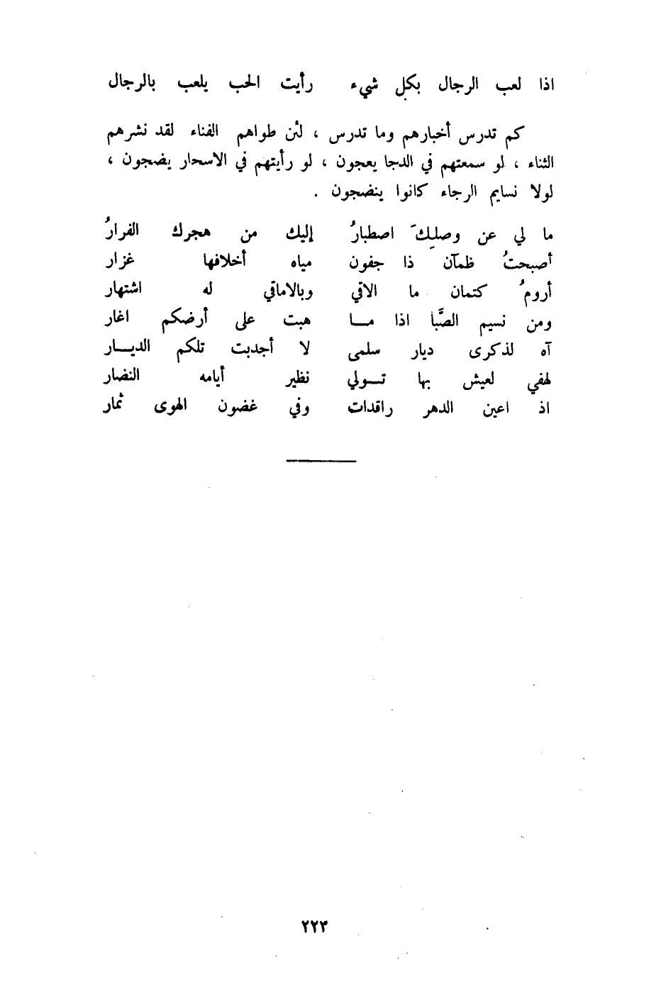 (إِذا لعب الرِّجَال بِكُل شَيْء ... رَأَيْت الْحبّ يلْعَب بِالرِّجَالِ)