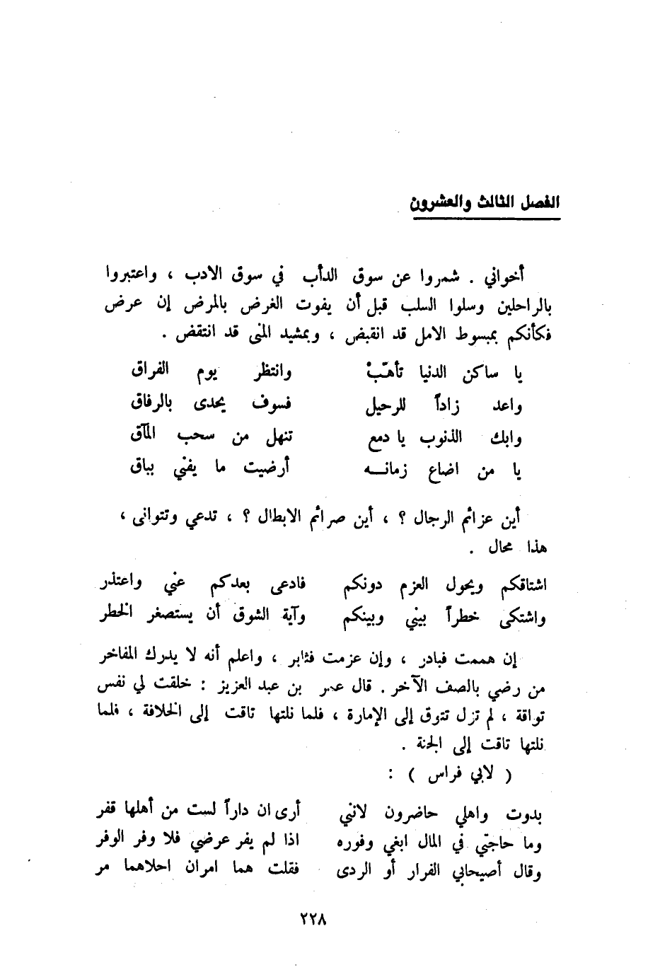 إِن هَمَمْت فبادر وَإِن عزمت فثابر وَاعْلَم أَنه لَا يدْرك المفاخر من رَضِي بالصف الآخر قَالَ عمر بن عبد الْعَزِيز خلقت لي نفس تواقة لم تزل تتوق إِلَى الْإِمَارَة فَلَمَّا نلتها تاقت إِلَى الْخلَافَة فَلَمَّا نلتها تاقت إِلَى الْجنَّة