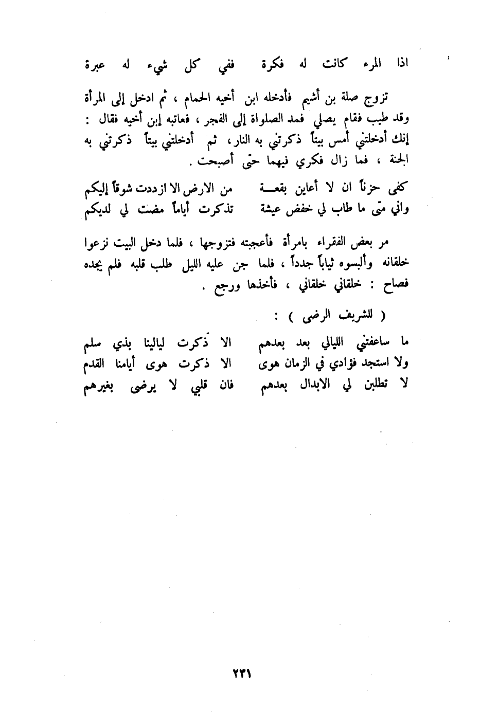 تزوج صلَة بن أَشْيَم فَأدْخلهُ ابْن أَخِيه الْحمام ثمَّ ادخل إِلَى الْمَرْأَة وَقد طيب فَقَامَ يُصَلِّي فَمد الصلواة إِلَى الْفجْر فَعَاتَبَهُ إِبْنِ أَخِيه فَقَالَ إِنَّك أدخلتني أمس بَيْتا ذَكرتني بِهِ النَّار ثمَّ أدخلتني بَيْتا ذَكرتني بِهِ الْجنَّة فَمَا زَالَ فكري فيهمَا حَتَّى أَصبَحت