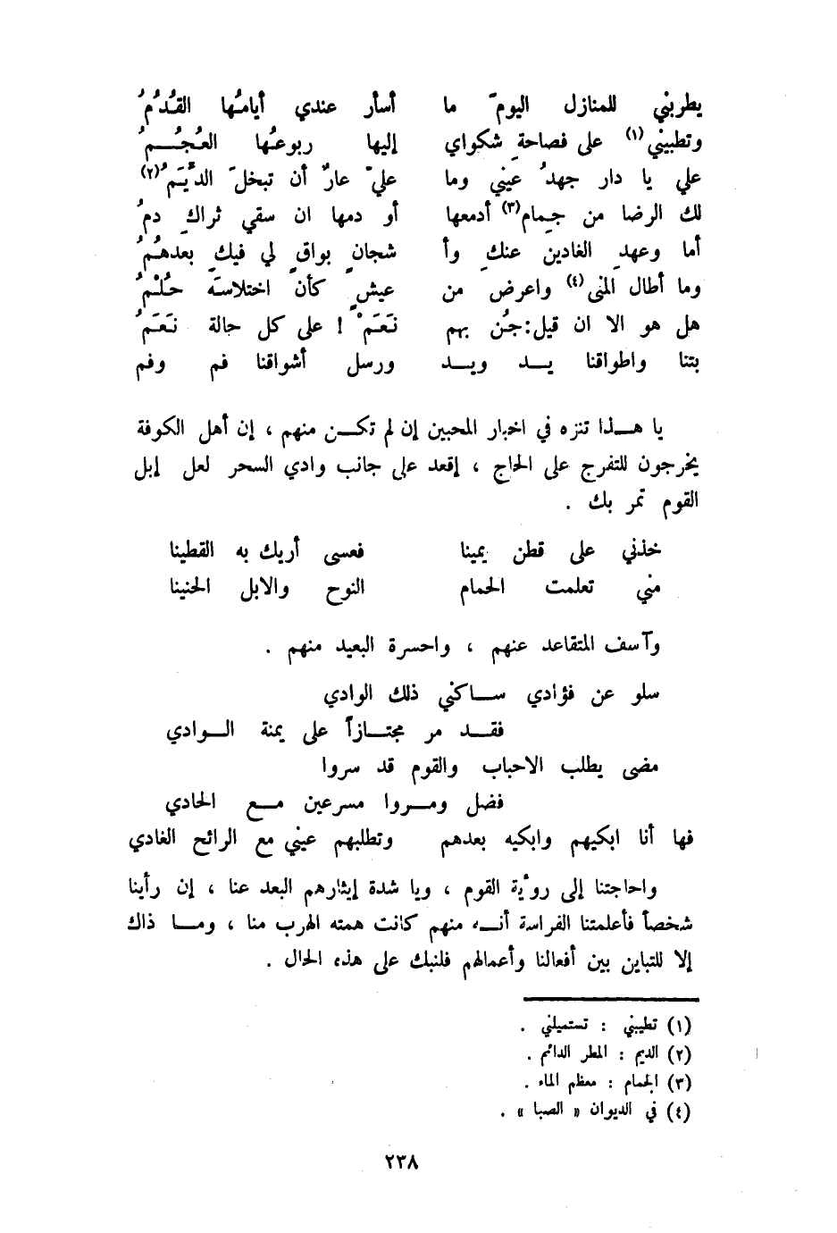 يَا هَذَا تنزه فِي أَخْبَار المحبين إِن لم تكن مِنْهُم إِن أهل الْكُوفَة يخرجُون للتفرج على الْحَاج أقعد على جَانب وَادي السحر لَعَلَّ إبل الْقَوْم تمر بك