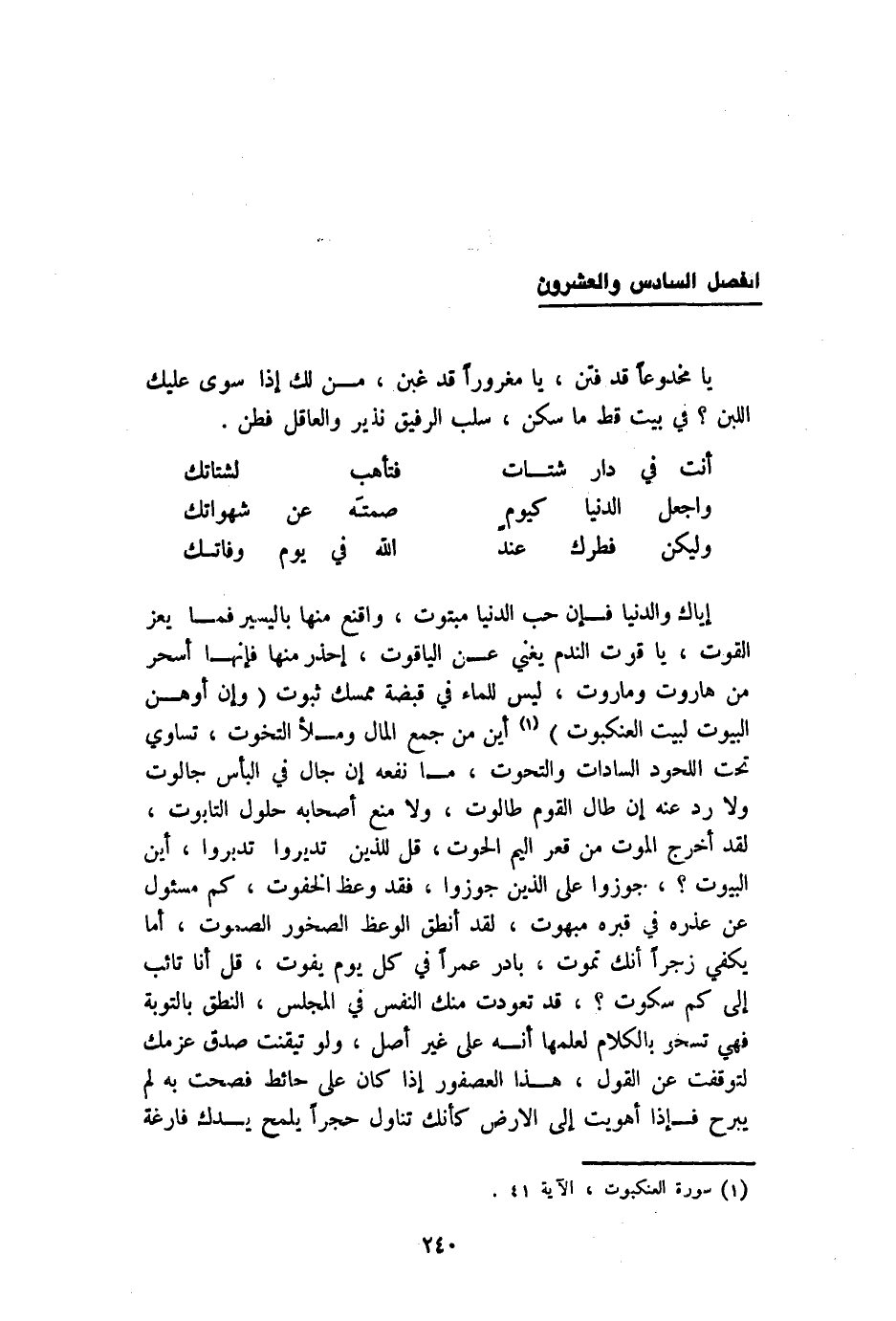 إياك وَالدُّنْيَا فَإِن حب لدُنْيَا مبتوت واقنع مِنْهَا باليسير فَمَا يعز الْقُوت يَا قوت النَّدَم يُغني عَن الْيَاقُوت إحذر مِنْهَا فَإِنَّهَا أَسحر من هاروت وماروت لَيْسَ للْمَاء فِي قَبْضَة مُمْسك ثُبُوت {وَإِن أوهن الْبيُوت لبيت العنكبوت} أَيْن من جمع المَال وملأ التخوت تَسَاوِي تَحت اللحود السادات والتحوت مَا نَفعه إِن جال فِي الْبَأْس جالوت وَلَا رد عَنهُ إِن طَال الْقَوْم طالوت وَلَا منع أَصْحَابه حُلُول التابوت لقد أخرج الْمَوْت من قَعْر أَلِيم الْحُوت قل للَّذين تديروا تدبروا أَيْن الْبيُوت جوزوا على الَّذين جوزوا فقد وعظ الخفوت كم مسئول عَن عذره فِي قَبره مبهوت لقد أنطق الْوَعْظ الصخور الصموت أما يَكْفِي زجرا أَنَّك تَمُوت بَادر عمرا فِي كل يَوْم يفوت قل أَنا تائب إِلَى كم سكُوت قد تعودت مِنْك النَّفس فِي الْمجْلس النُّطْق بِالتَّوْبَةِ فَهِيَ تسخو بالْكلَام لعلمها أَنه على غير أصل وَلَو تيقنت صدق عزمك لتوقفت عَن القَوْل هَذَا العصفور إِذا كَانَ على حَائِط فَصحت بِهِ لم يبرح فَإِذا أهويت إِلَى الأَرْض كَأَنَّك تنَاول حجرا يلمح يدك فارغة
