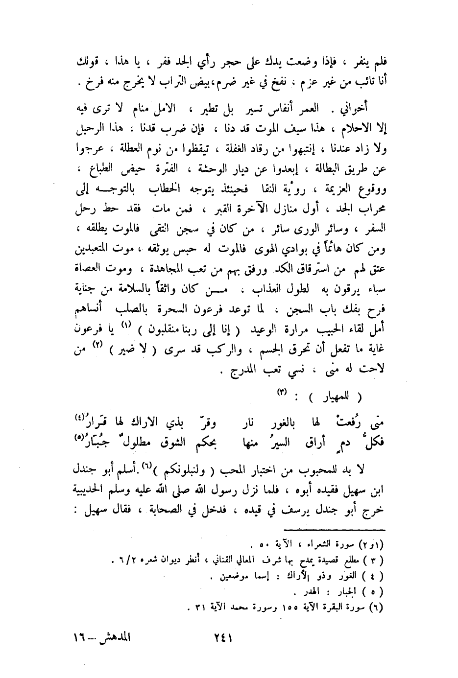 أخواني الْعُمر أنفاس تسير بل تطير الأمل مَنَام لَا ترى فِيهِ إِلَّا الأحلام هَذَا سيف الْمَوْت قد دنا فَإِن ضرب قدنا هَذَا الرحيل وَلَا زَاد عندنَا إنتبهوا من رقاد الْغَفْلَة تيقظوا من نوم العطلة عرجوا عَن طَرِيق البطالة إبعدوا عَن ديار الوحشة الفترة حيض الطباع وَوُقُوع الْعَزِيمَة رُؤْيَة النقا فَحِينَئِذٍ يتَوَجَّه الْخطاب بالتوجه إِلَى محراب الْجد أول منَازِل الْآخِرَة الْقَبْر فَمن مَاتَ فقد حط رَحل السّفر وَسَائِر الورى سَائِر من كَانَ فِي سجن التقى فالموت يُطلقهُ وَمن كَانَ هائما فِي بوادي الْهوى فالموت لَهُ حسب يوثقه موت المتعبدين عتق لَهُم من استرقاق الكد ورفق بهم من تَعب المجاهدة وَمَوْت العصاة سباء يرقون بِهِ لطول الْعَذَاب من كَانَ واثقا بالسلامة من جِنَايَة فَرح بفك بَاب السجْن لما توعد فِرْعَوْن السَّحَرَة بالصلب أنساهم أمل لِقَاء الحبيب مرَارَة الْوَعيد {إِنَّا إِلَى رَبنَا منقلبون} يَا فِرْعَوْن غَايَة مَا تفعل أَن تحرق الْجِسْم والركب قد سرى {لَا ضير} من لاحت لَهُ منى نسي تَعب المدرج