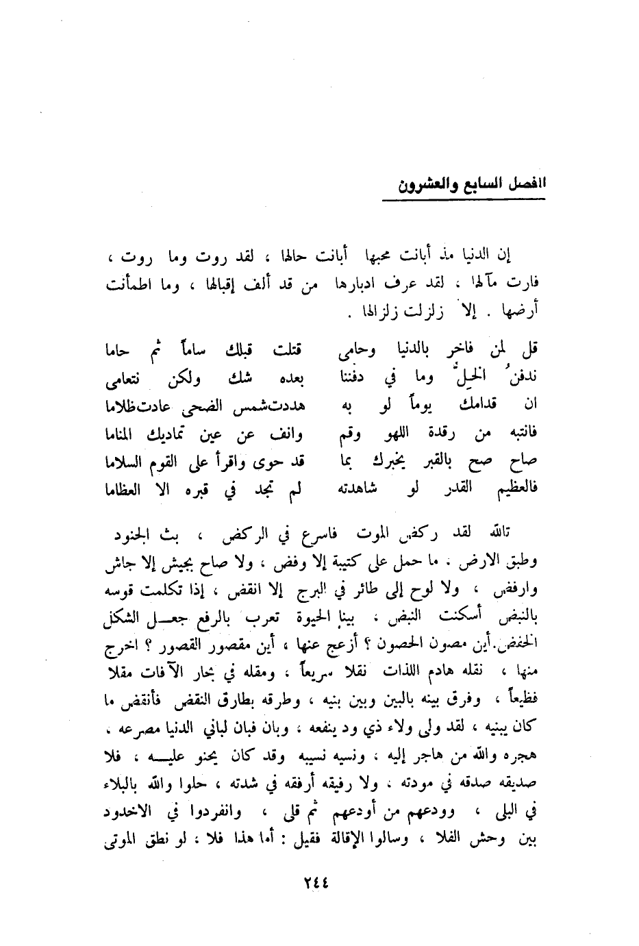 إِن الدُّنْيَا مذ أبانت محبها أبانت حَالهَا لقد رَوَت وَمَا رَوَت فارت مآلها لقد عرف أدبارها من قد ألف إقبالها وَمَا اطمأنت أرْضهَا إِلَّا زلزلت زِلْزَالهَا