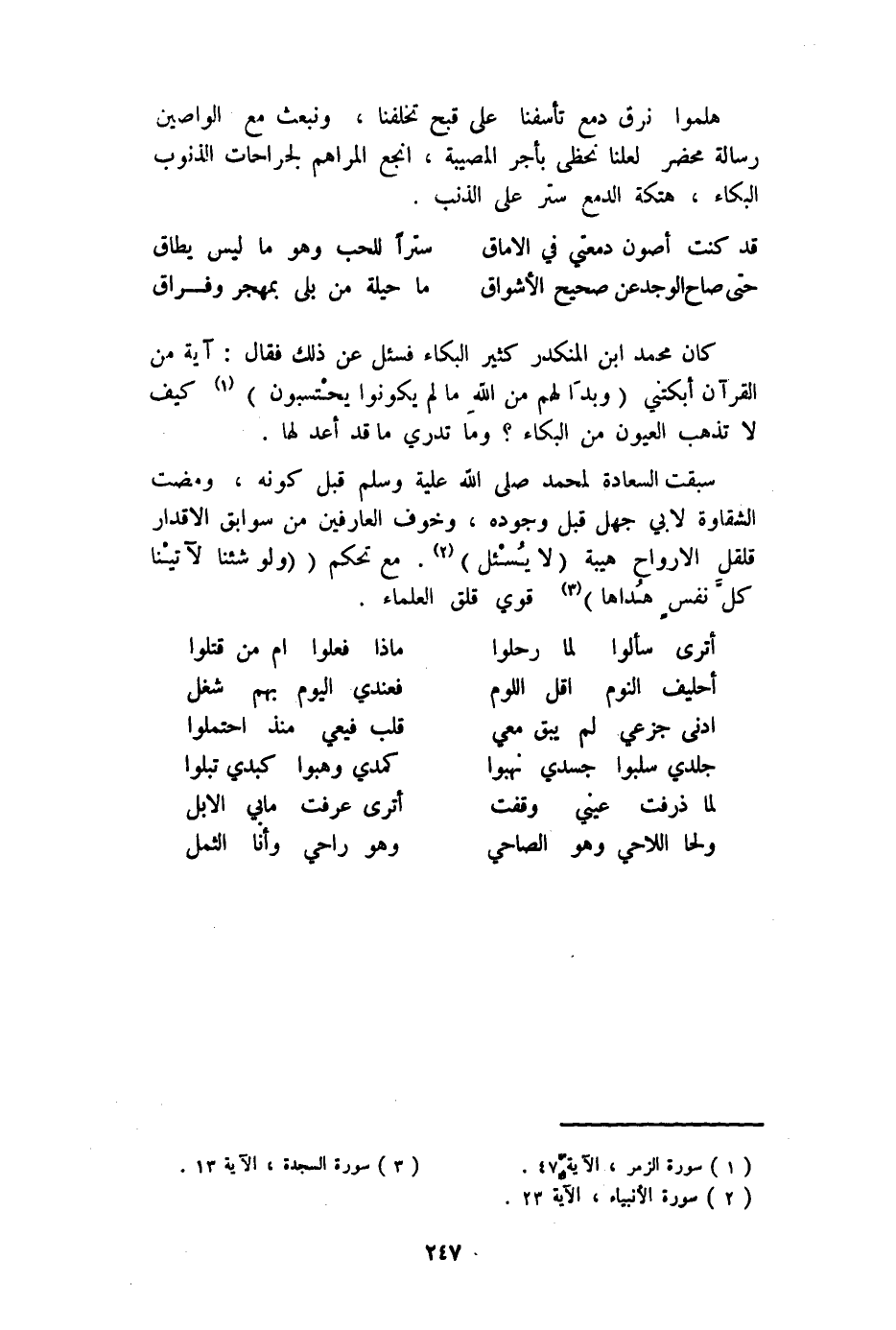 كَانَ مُحَمَّد ابْن الْمُنْكَدر كثير الْبكاء فَسئلَ عَن ذَلِك فَقَالَ آيَة من الْقُرْآن أبكتني {وبدا لَهُم من الله مَا لم يَكُونُوا يحتسبون} كَيفَ لَا تذْهب الْعُيُون من الْبكاء وَمَا تَدْرِي مَا قد أعد لَهَا