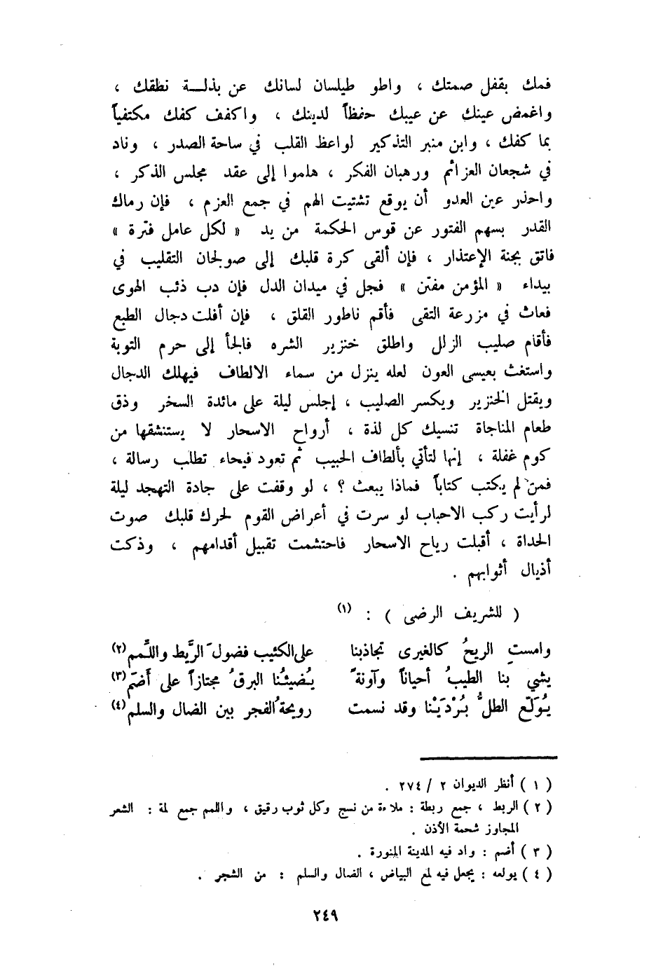فمك بقفل صمتك واطو طيلسان لسَانك عَن بذلة نطقك واغمض عَيْنك عَن عيبك حفظا لدينك واكفف كفك مكتفيا بِمَا كفك وَابْن مِنْبَر التَّذْكِير لواعظ الْقلب فِي ساحة الصَّدْر وناد فِي شجعان العزائم وَرُهْبَان الْفِكر هلموا إِلَى عقد مجْلِس الذّكر وَاحْذَرْ عين الْعَدو أَن يُوقع تشتيت الْهم فِي جمع الْعَزْم فَإِن رماك الْقدر بِسَهْم الفتور عَن قَوس الْحِكْمَة من يَد لكل عَامل فَتْرَة فَاتق بجنة الإعتذار فَإِن ألْقى كرة قَلْبك إِلَى صولجان التقليب فِي بيداء الْمُؤمن مفتن فجل فِي ميدان الدل فَإِن دب ذِئْب الْهوى فعاث فِي مزرعة التقى فأقم ناطور القلق فَإِن أفلت دجال الطَّبْع فَأَقَامَ صَلِيب الزلل واطلق خِنْزِير الشره فالجأ إِلَى حرم التَّوْبَة واستغث بِعِيسَى العون لَعَلَّه ينزل من سَمَاء الألطاف فَيهْلك الدَّجَّال وَيقتل الْخِنْزِير وَيكسر الصَّلِيب إجلس لَيْلَة على مائدة السخر وذق طَعَام الْمُنَاجَاة تنسيك كل لَذَّة أَرْوَاح الأسحار لَا يستنشقها من كوم غَفلَة إِنَّهَا لتأتي بألطاف الحبيب ثمَّ تعود فيحاء تطلب رِسَالَة فَمن لم يكْتب كتابا فَمَاذَا يبْعَث لَو وقفت على جادة التَّهَجُّد لَيْلَة لرأيت ركب الأحباب لَو سرت فِي أَعْرَاض الْقَوْم لحرك قَلْبك صَوت الحداة أَقبلت ريَاح الأسحار فاحتشمت تَقْبِيل أَقْدَامهم وذكت أذيال أثوابهم