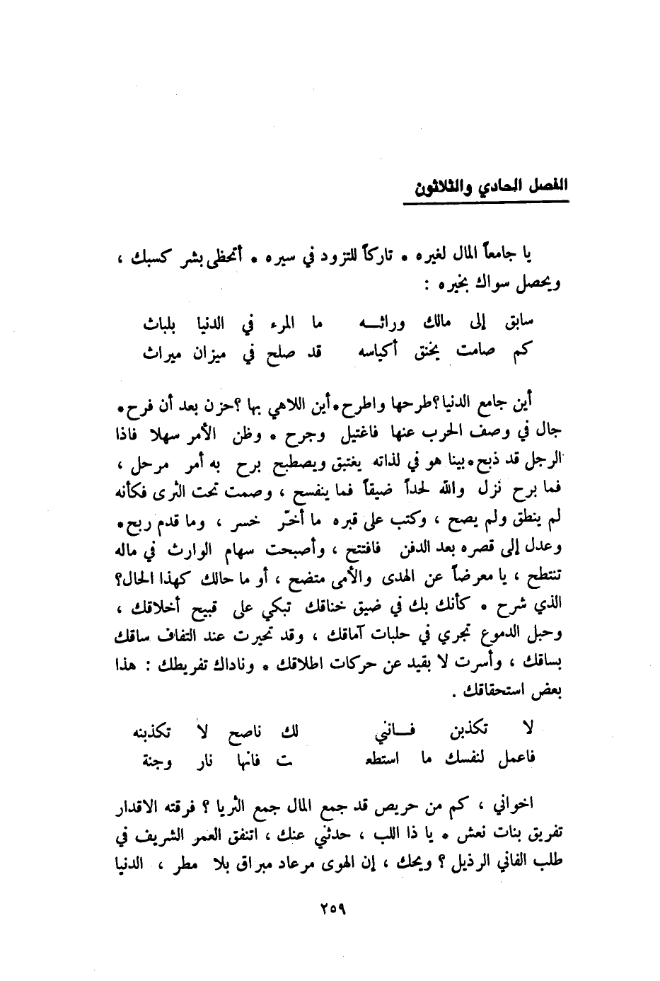 أخواني كم من حَرِيص قد جمع المَال جمع الثريا فرقته الأقدار تَفْرِيق بَنَات نعش يَا ذَا اللب حَدثنِي عَنْك اتنفق الْعُمر الشريف فِي طلب الفاني الرذيل وَيحك إِن الْهوى مرعاد مبراق بِلَا مطر الدُّنْيَا