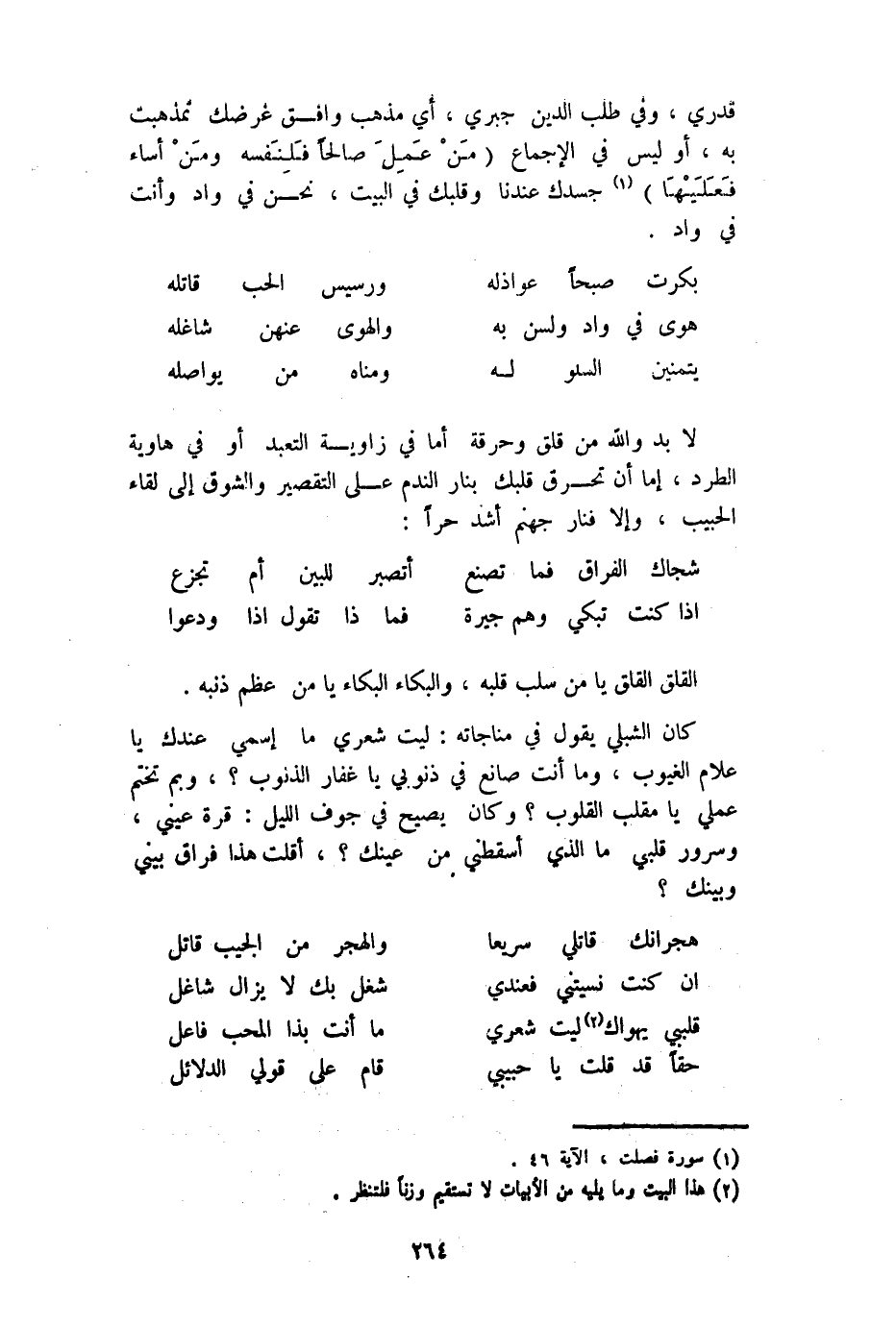 قدري وَفِي طلب الدّين جبري أَي مَذْهَب وَافق غرضك تمذهب بِهِ أوليس فِي الْإِجْمَاع {من عمل صَالحا فلنفسه وَمن أَسَاءَ فعلَيْهَا} جسدك عندنَا وقلبك فِي الْبَيْت نَحن فِي وَاد وَأَنت فِي وَاد
