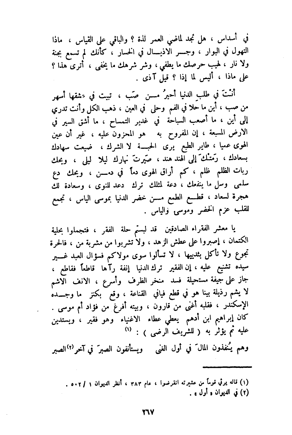 أَنْت فِي طلب الدُّنْيَا أحير من صب تبيت فِي عَشِقَهَا أسهر من صب أَيْن مَا حلا فِي الْفَم وحلى فِي الْعين ذهب الْكل وَأَنت تَدْرِي إِلَى أَيْن مَا أصعب السباحة فِي غَدِير التمساح مَا أشق السّير فِي الأَرْض المسبعة إِن المفروح بِهِ هُوَ المحزون عَلَيْهِ غير أَن عين الْهوى عميا طاير الطَّبْع يرى الْحبَّة لَا الشّرك ضيعت سهادك بسعادك رمتك إِلَى الْهِنْد هِنْد صيرت نهارك لَيْلًا ليلى وَيحك ربات الظُّلم ظلم كم أراق الْهوى دَمًا فِي دمن وَيحك دع سلمى وسل مَا ينفعك دعة لمثلك ترك دعد للنوى وسعادة لَك هِجْرَة لسعاد قطع الطمع من خضر الدُّنْيَا بمُوسَى الياس تجمع للقلب عزم الْخضر ومُوسَى والياس