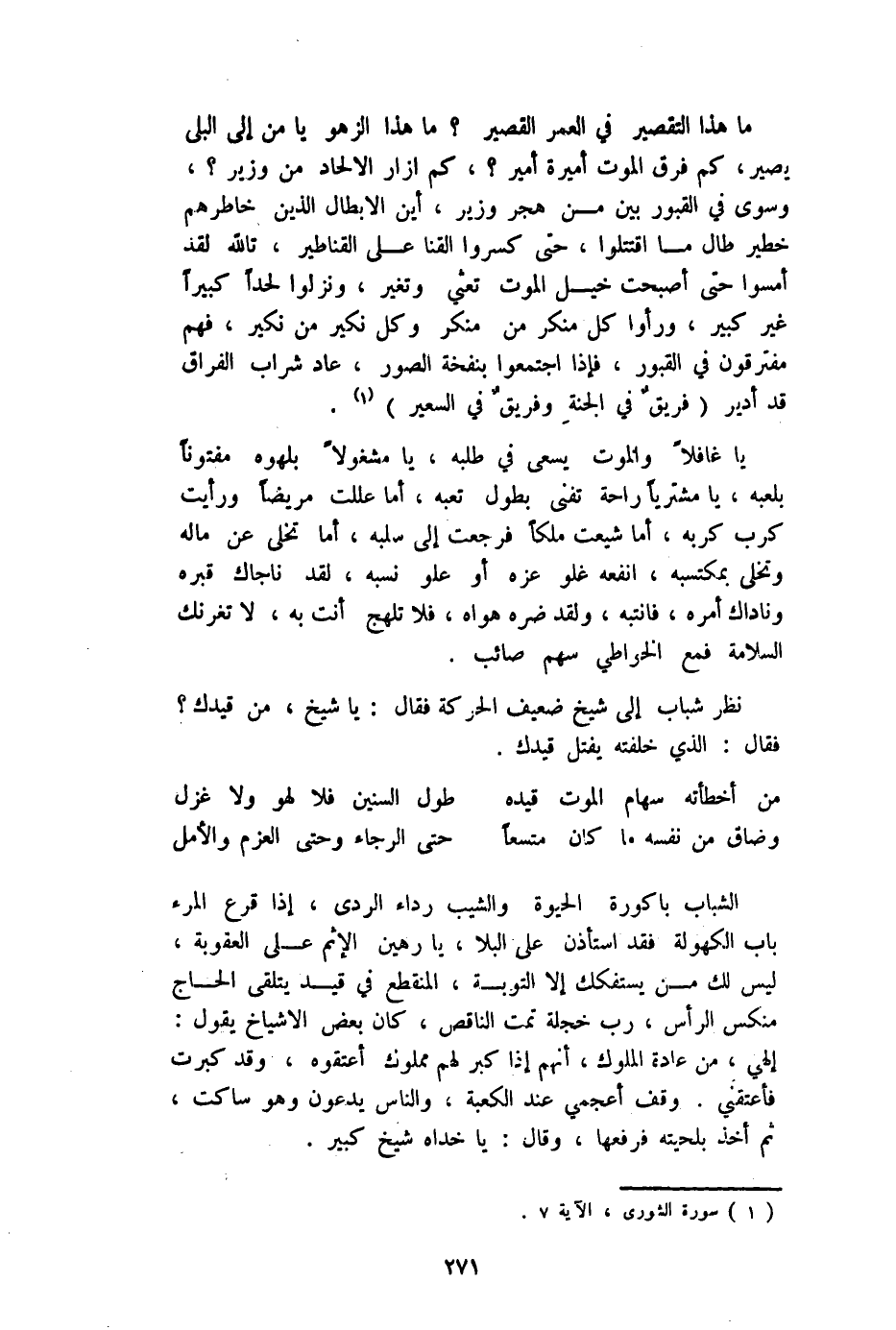 الشَّبَاب باكورة الحيوة والشيب رِدَاء الردى إِذا قرع الْمَرْء بَاب الكهولة فقد اسْتَأْذن على البلا يَا رهين الْإِثْم على الْعقُوبَة لَيْسَ لَك من يستفكك إِلَّا التَّوْبَة الْمُنْقَطع فِي قيد يتلَقَّى الْحَاج منكس الرَّأْس رب خجلة تمت النَّاقِص كَانَ بعض الْأَشْيَاخ يَقُول إلهي من عَادَة الْمُلُوك أَنهم إِذا كبر لَهُم مَمْلُوك أعتقوه وَقد كَبرت فأعتقني وقف أعجمي عِنْد الْكَعْبَة وَالنَّاس يدعونَ وَهُوَ سَاكِت ثمَّ أَخذ بلحيته فَرَفعهَا وَقَالَ يَا خداه شيخ كَبِير