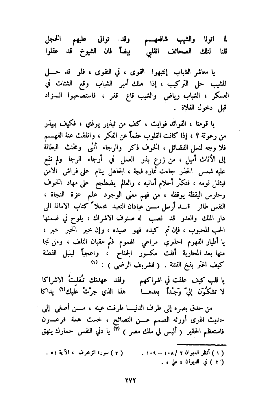 يَا قَومنَا الْفَوَائِد فوايت كف من تبذير يوذي فَكيف ببيذر من رعونة إِذا كَانَت الْقُلُوب عقما عَن الْفِكر واتفقت عنة الْفَهم فَلَا وَجه لنسل الْفَضَائِل الْخَوْف ذكر والرجاء أُنْثَى ومخنث البطالة إِلَى الأناث أميل من زرع بذر الْعَمَل فِي أرجاء الرجا وَلم تقع عَلَيْهِ شمس الحذر جَاءَت ثماره فجة الْجَاهِل ينَام على فرَاش الْأَمْن فيثقل نَومه فتكثر أَحْلَام أمانيه والعالم يضطجع على مهاد الْخَوْف وحارس الْيَقَظَة يوقظه من فهم معنى الْوُجُود علم عزة النجَاة النَّفس طَائِر قد أرسل من عبادان التَّعَبُّد محملًا كتاب الْأَمَانَة إِلَى دَار الْملك والعدو قد نصب لَهُ صنوف الْإِشْرَاك يلوح فِي ضمنهَا الْحبّ المحبوب فَإِن تمّ كَيده فَهُوَ صَيْده وَإِن خبر الْخَبَر عبر يَا أطيار الفهوم احذري مرَاعِي الهموم فثم عقبان التّلف وَمن نجا مِنْهَا بعد الْمُحَاربَة أفلت مكسور الْجنَاح وَاعجَبا لبلبل الفطنة كَيفَ اغْترَّ بفخ الْفِتْنَة للشريف الرضى