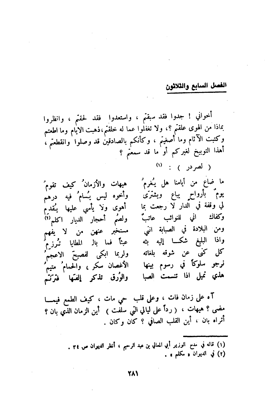 آه على زمَان فَاتَ وعَلى قلب حَيّ مَاتَ كَيفَ الطمع فِيمَا مضى هَيْهَات ردا على ليَالِي الَّتِي سلفت أَيْن الزَّمَان الَّذِي بَان أتراه بَان أَيْن الْقلب الصافي كَانَ وَكَانَ