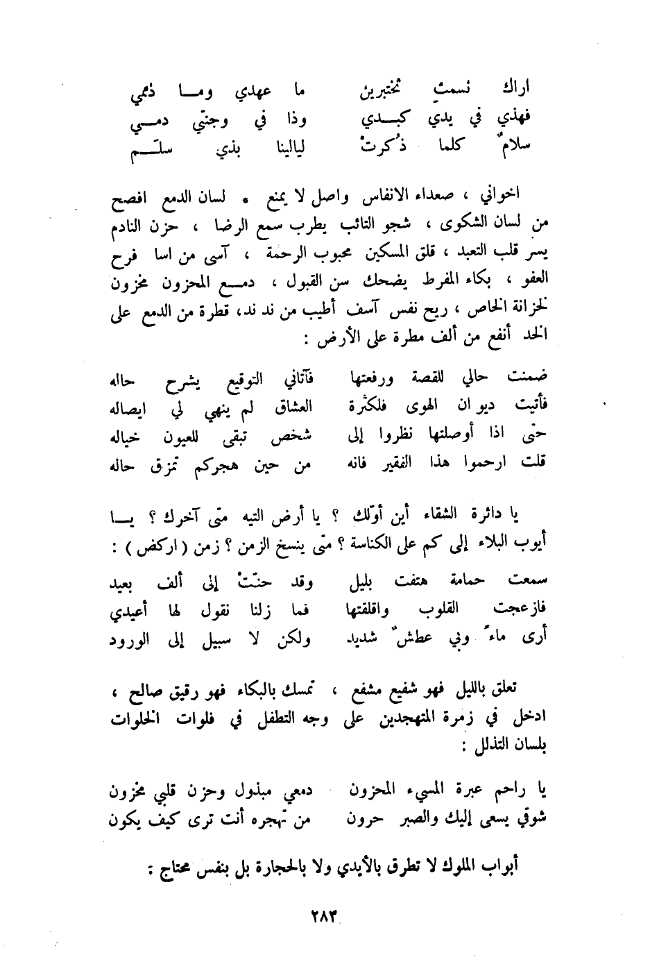 أخواني صعداء الأنفاس وَاصل لَا يمْنَع لِسَان الدمع افصح من لِسَان الشكوى شجو التائب يطرب سمع الرِّضَا حزن النادم يسر قلب التَّعَبُّد قلق الْمِسْكِين مَحْبُوب الرَّحْمَة آسى من أسا فَرح الْعَفو بكاء المفرط يضْحك سنّ الْقبُول دمع المحزون مخزون لخزانة الْخَاص ريح نفس آسَف أطيب من ند ند قَطْرَة من الدمع على الخد أَنْفَع من ألف مطرة على الأَرْض