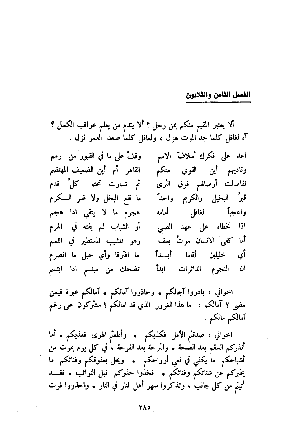 أَلا يعْتَبر الْمُقِيم مِنْكُم بِمن رَحل أَلا ينْدَم من يعلم عواقب الكسل أه لغافل كلما جد الْمَوْت هزل ولعاقل كلما صعد الْعُمر نزل