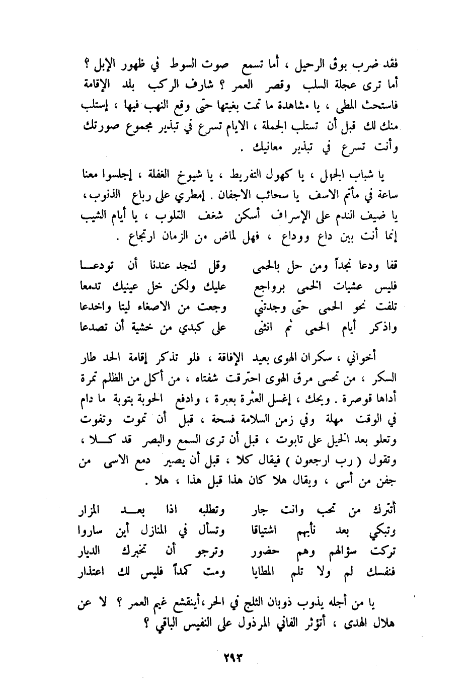 يَا شباب الْجَهْل يَا كهول التَّفْرِيط يَا شُيُوخ الْغَفْلَة إجلسوا مَعنا سَاعَة فِي مأتم الأسف يَا سحائب الأجفان إمطري على رباع الذُّنُوب يَا ضيف النَّدَم على الْإِسْرَاف أسكن شغف الْقُلُوب يَا أَيَّام الشيب إِنَّمَا أَنْت بَين دَاع ووداع فَهَل لماض من الزَّمَان ارتجاع