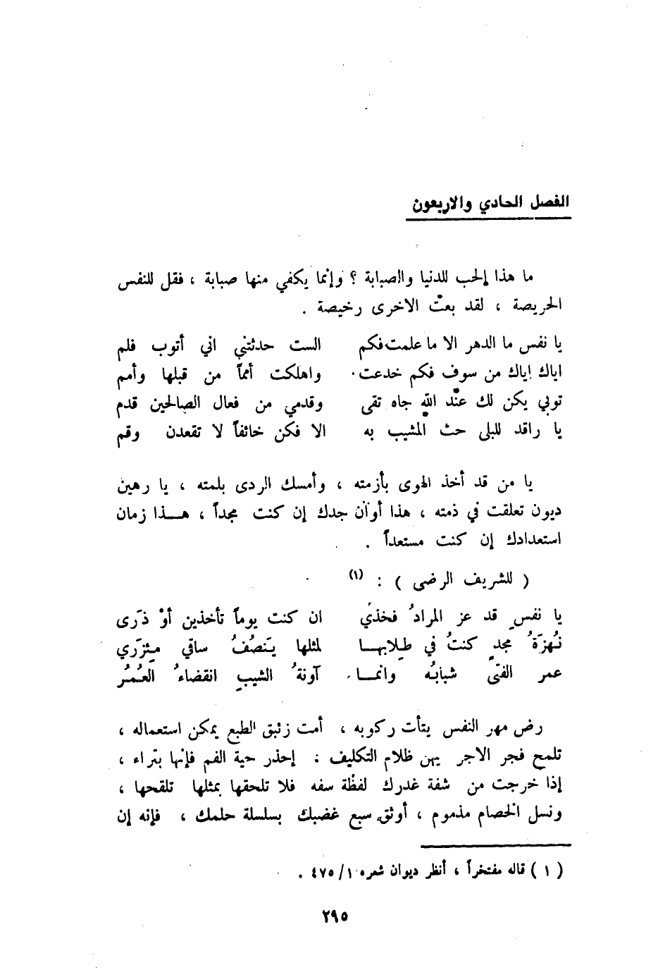 رض مهر النَّفس يتأت ركُوبه أمت زئبق الطَّبْع يُمكن اسْتِعْمَاله تلمح فجر الْأجر يهن ظلام التَّكْلِيف إحذر حَيَّة الْفَم فَإِنَّهَا بتراء إِذا خرجت من شفة غدرك لَفْظَة سفه فَلَا تلحقها بِمِثْلِهَا تلقحها ونسل الْخِصَام مَذْمُوم أوثق سبع غضبك بسلسلة حلمك فَإِنَّهُ إِن