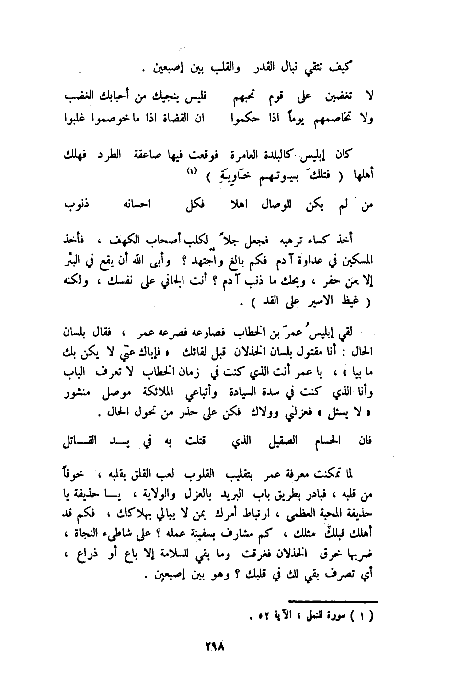 لَقِي إِبْلِيس عمر بن الْخطاب فصارعه فصرعه عمر فَقَالَ بِلِسَان الْحَال أَنا مقتول بِلِسَان الخذلان قبل لقائك فإياك عني لَا يكن بك مَا بيا يَا عمر أَنْت الَّذِي كنت فِي زمَان الْخطاب لَا تعرف الْبَاب وَأَنا الَّذِي كنت فِي سدة السِّيَادَة وأتباعي الْمَلَائِكَة موصل منشور لَا يسئل فعزلني وولاك فَكُن على حذر من تحول الْحَال