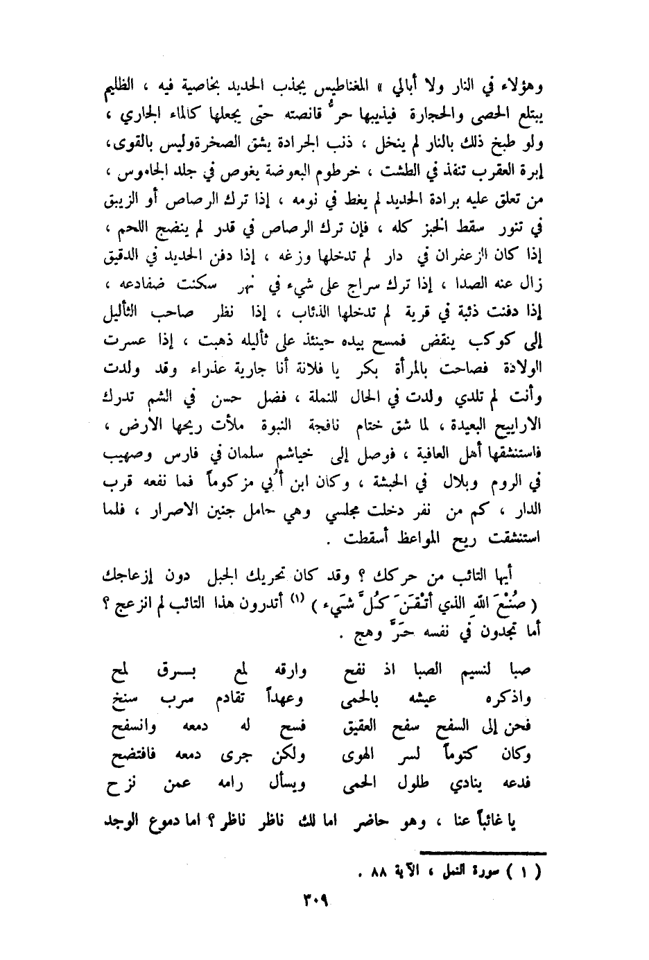 وَهَؤُلَاء فِي النَّار وَلَا أُبَالِي المغناطيس يجذب الْحَدِيد بخاصية فِيهِ الظليم يبتلع الْحَصَى وَالْحِجَارَة فيذيبها حر قانصته حَتَّى يَجْعَلهَا كَالْمَاءِ الْجَارِي وَلَو طبخ ذَلِك بالنَّار لم ينخل ذَنْب الجرادة يشق الصَّخْرَة وَلَيْسَ بالقوى إبرة الْعَقْرَب تنفذ فِي الطشت خرطوم الْبَعُوضَة يغوص فِي جلد الجاموس من تعلق عَلَيْهِ برادة الْحَدِيد لم يغط فِي نَومه إِذا ترك الرصاص أَو الزيبق فِي تنور سقط الْخبز كُله فَإِن ترك الرصاص فِي قدر لم ينضج اللَّحْم إِذا كَانَ الزَّعْفَرَان فِي دَار لم تدْخلهَا وزغه إِذا دفن الْحَدِيد فِي الدَّقِيق زَالَ عَنهُ الصدا إِذا ترك سراج على شَيْء فِي نهر سكنت ضفادعه إِذا دفنت ذئبة فِي قَرْيَة لم تدْخلهَا الذئاب إِذا نظر صَاحب الثأليل إِلَى كَوْكَب ينْقض فَمسح بِيَدِهِ حِينَئِذٍ على ثأليله ذهبت إِذا عسرت الْولادَة فصاحت بِالْمَرْأَةِ بكر يَا فُلَانَة أَنا جَارِيَة عذراء وَقد ولدت وَأَنت لم تلدي ولدت فِي الْحَال للنملة فضل حسن فِي الشم تدْرك الأراييح الْبَعِيدَة لما شقّ ختام نافجة النُّبُوَّة مَلَأت رِيحهَا الأَرْض فاستنشقها أهل الْعَافِيَة فوصل إِلَى خياشم سلمَان فِي فَارس وصهيب فِي الرّوم وبلال فِي الْحَبَشَة وَكَانَ ابْن أبي مزكوما فَمَا نَفعه قرب الدَّار كم من نفر دخلت مجلسي وَهِي حَامِل جَنِين الْإِصْرَار فَلَمَّا استنشقت ريح المواعظ أسقطت