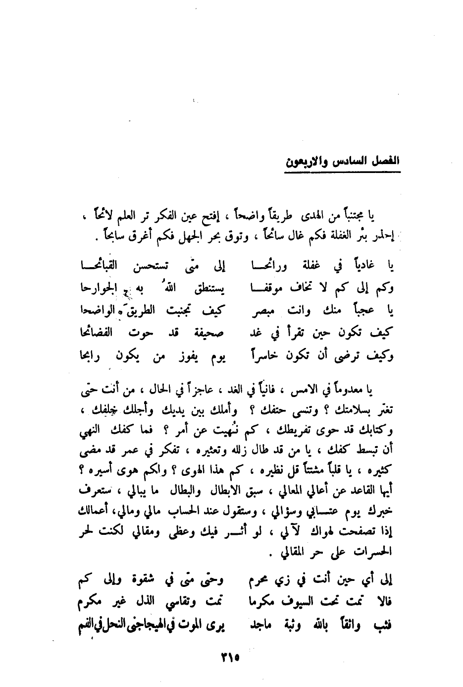 يَا مجتنبا من الْهدى طَرِيقا وَاضحا إفتح عين الْفِكر تَرَ الْعلم لائحا إحذر بِئْر الْغَفْلَة فكم غال سائحا وتوق بَحر الْجَهْل فكم أغرق سابحا