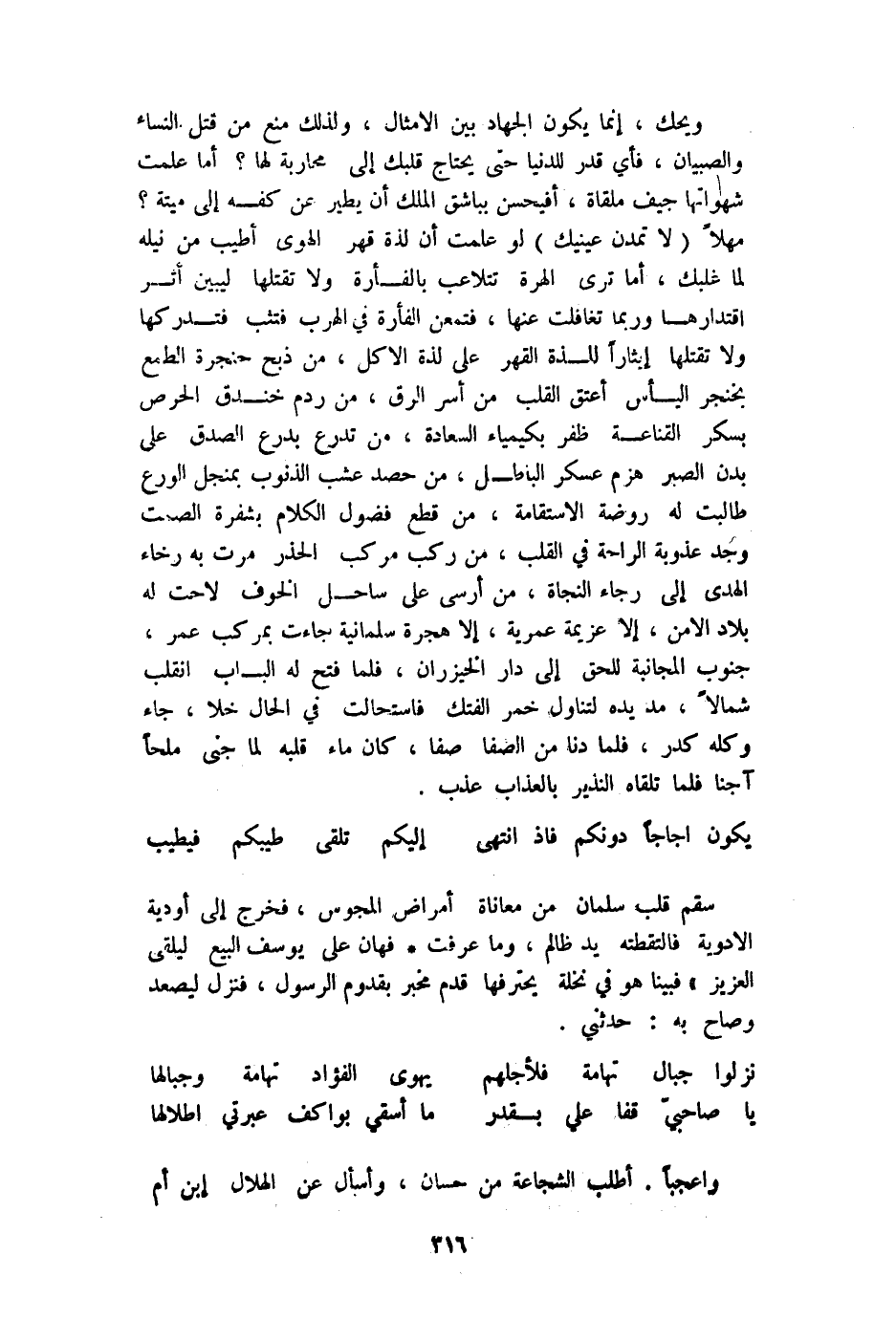 وَيحك إِنَّمَا يكون الْجِهَاد بَين الْأَمْثَال وَلذَلِك منع من قتل النِّسَاء وَالصبيان فَأَي قدر للدنيا حَتَّى يحْتَاج قَلْبك إِلَى محاربة لَهَا أما علمت شهواتها جيف ملقاة أفيحسن بباشق الْملك أَن يطير عَن كَفه إِلَى ميتَة مهلا لَا تَمُدَّن عَيْنَيْك لَو علمت أَن لَذَّة قهر الْهوى أطيب من نيله لما غلبك أما ترى الْهِرَّة تتلاعب بالفأرة وَلَا تقتلها لبين أثر إقتدارها وَرُبمَا تغافلت عَنْهَا فتمعن الْفَأْرَة فِي الْهَرَب فتثب فتدركها وَلَا تقتلها إيثارا للذة الْقَهْر على لَذَّة الْأكل من ذبح حنجرة الطمع بخنجر الْيَأْس أعتق الْقلب من أسر الرّقّ من ردم خَنْدَق الْحِرْص بسكر القناعة ظفر بكيمياء السَّعَادَة من تدرع بدرع الصدْق على بدن الصَّبْر هزم عَسْكَر الْبَاطِل من حصد عشب الذُّنُوب بمنجل الْوَرع طالبت لَهُ رَوْضَة الإستقامة من قطع فضول الْكَلَام بشفرة الصمت وجد عذوبة الرَّاحَة فِي الْقلب من ركب مركب الحذر مرت بِهِ رخاء الْهدى إِلَى رَجَاء النجَاة من أرسى على سَاحل الْخَوْف لاحت لَهُ بِلَاد الْأَمْن إِلَّا عَزِيمَة عمرية إِلَّا هِجْرَة سلمانية جَاءَت بمركب عمر جنوب المجانبة للحق إِلَى دَار الخيزران فَلَمَّا فتح لَهُ الْبَاب انْقَلب شمالا مد يَده لتناول خمر الفتك فاستحالت فِي الْحَال خلا جَاءَ وَكله كدر فَلَمَّا دنا من الصَّفَا صفا كَانَ مَاء قلبه لما جنى ملحا آجنا فَلَمَّا تَلقاهُ النذير بِالْعَذَابِ عذب